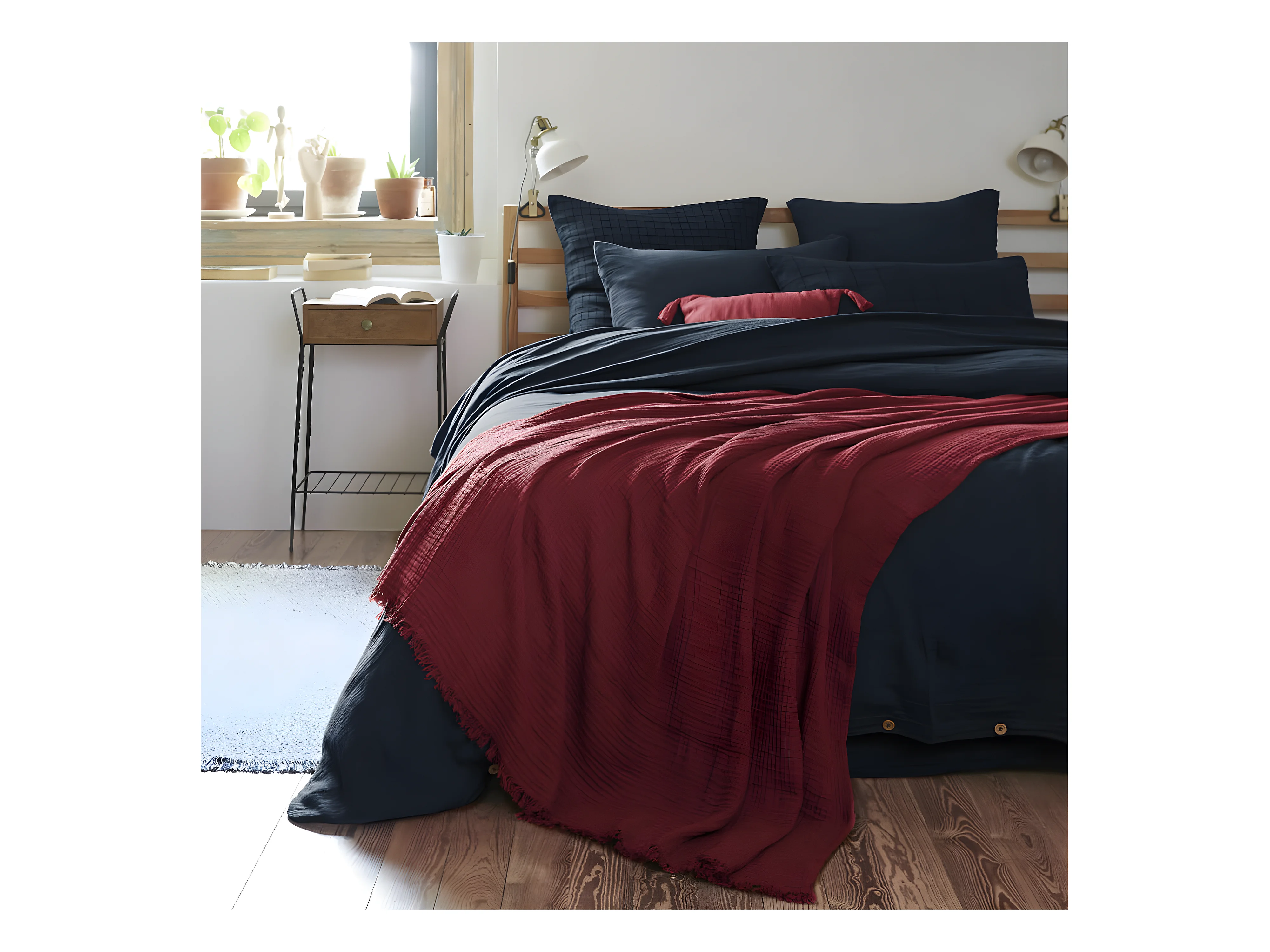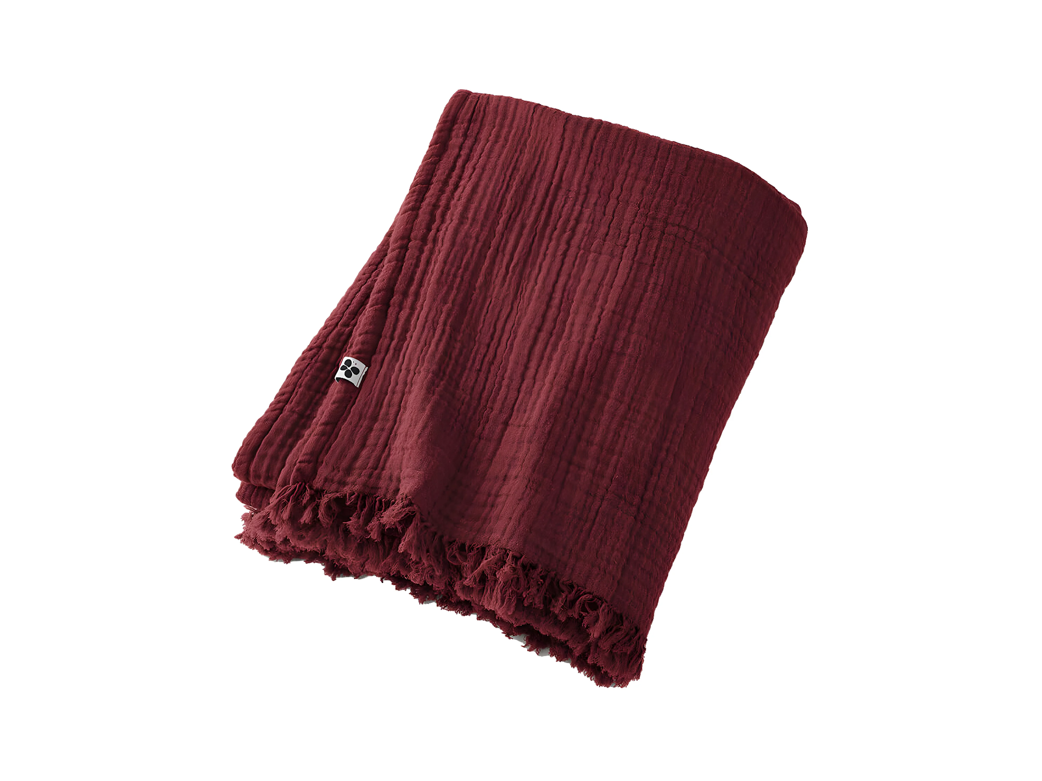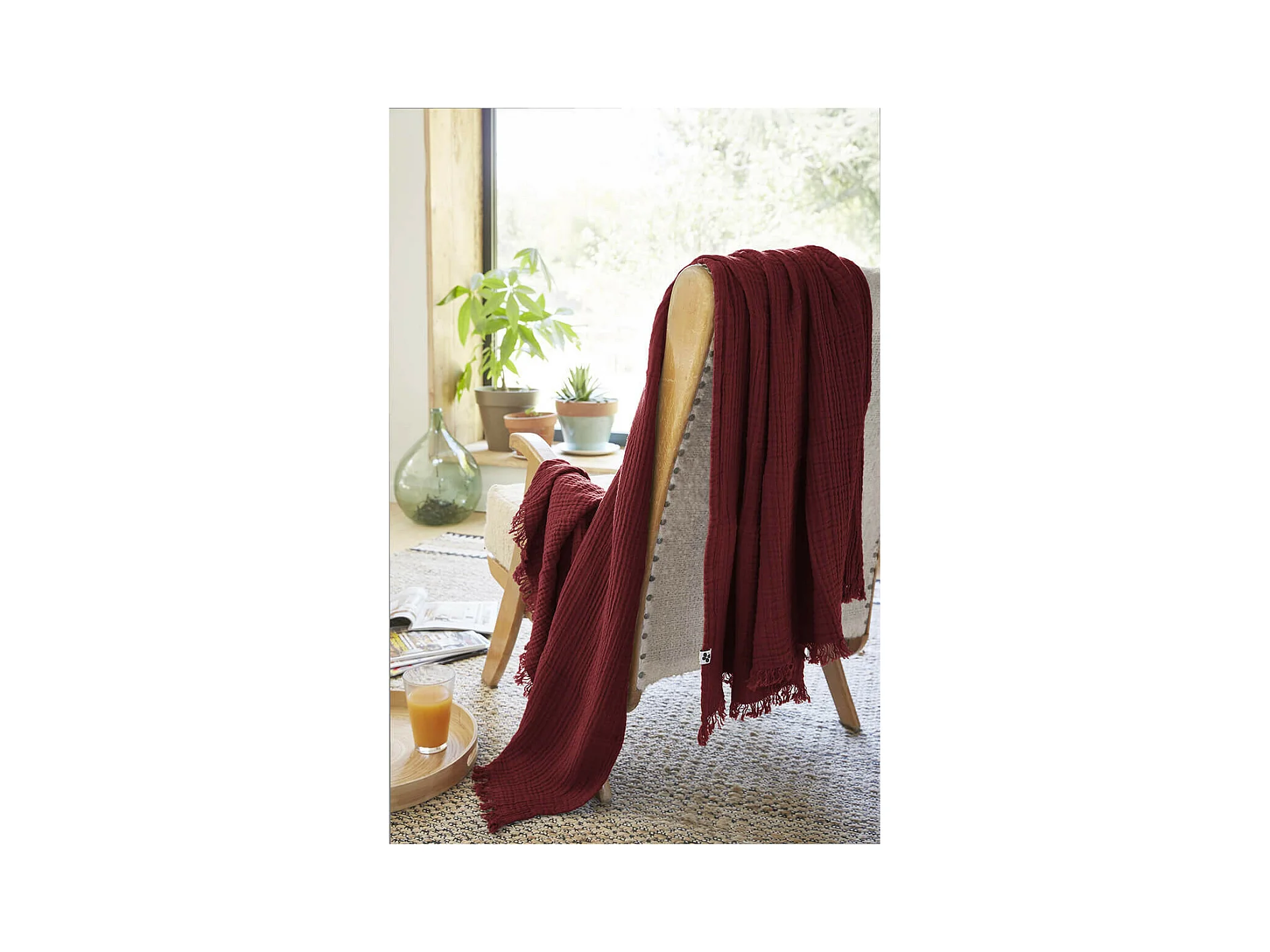 OUREA - Plaid à Franges 130x160cm 4 Epaisseurs Gaze de Coton Lie de Vin