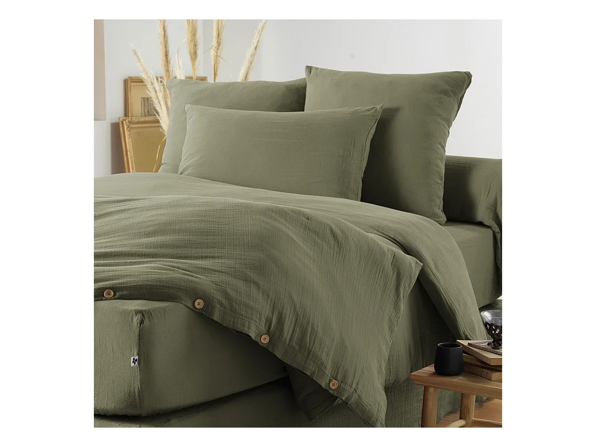 Parure de lit Housse de couette 2 personne + 2 taies d'oreiller en gaze de coton 240 x 260 cm coloris kaki