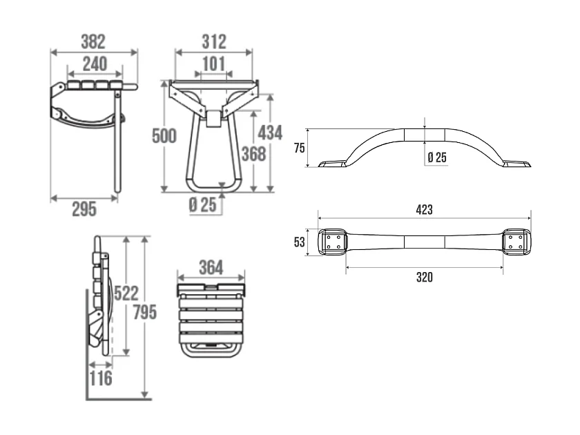 Pack avec siège de douche PMR PELLET escamotable noir mat + 2 barres d'appui 42,5 cm