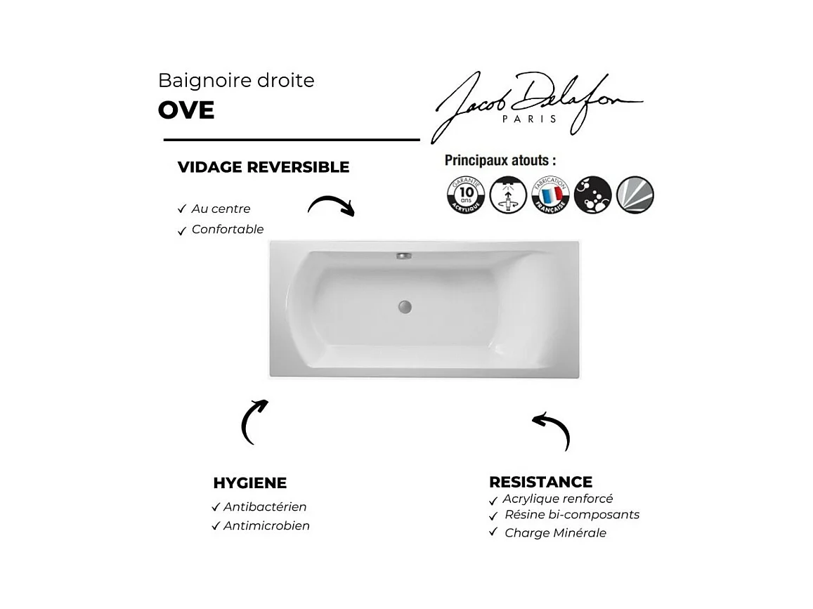 Pack baignoire droite 180 X 80 JACOB DELAFON Ove + pare bain chromé