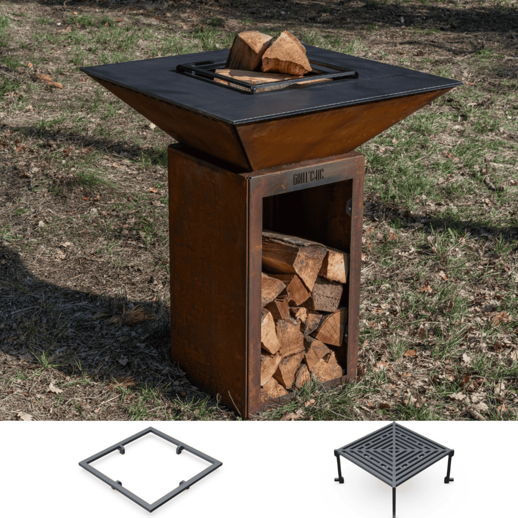 Pack Découverte Brasero CEVENOL Simple Cuve Corten Carré 74x90 cm - Avec rangement bois - Un brasero carré au style naturel pour une cuisine extérieure conviviale