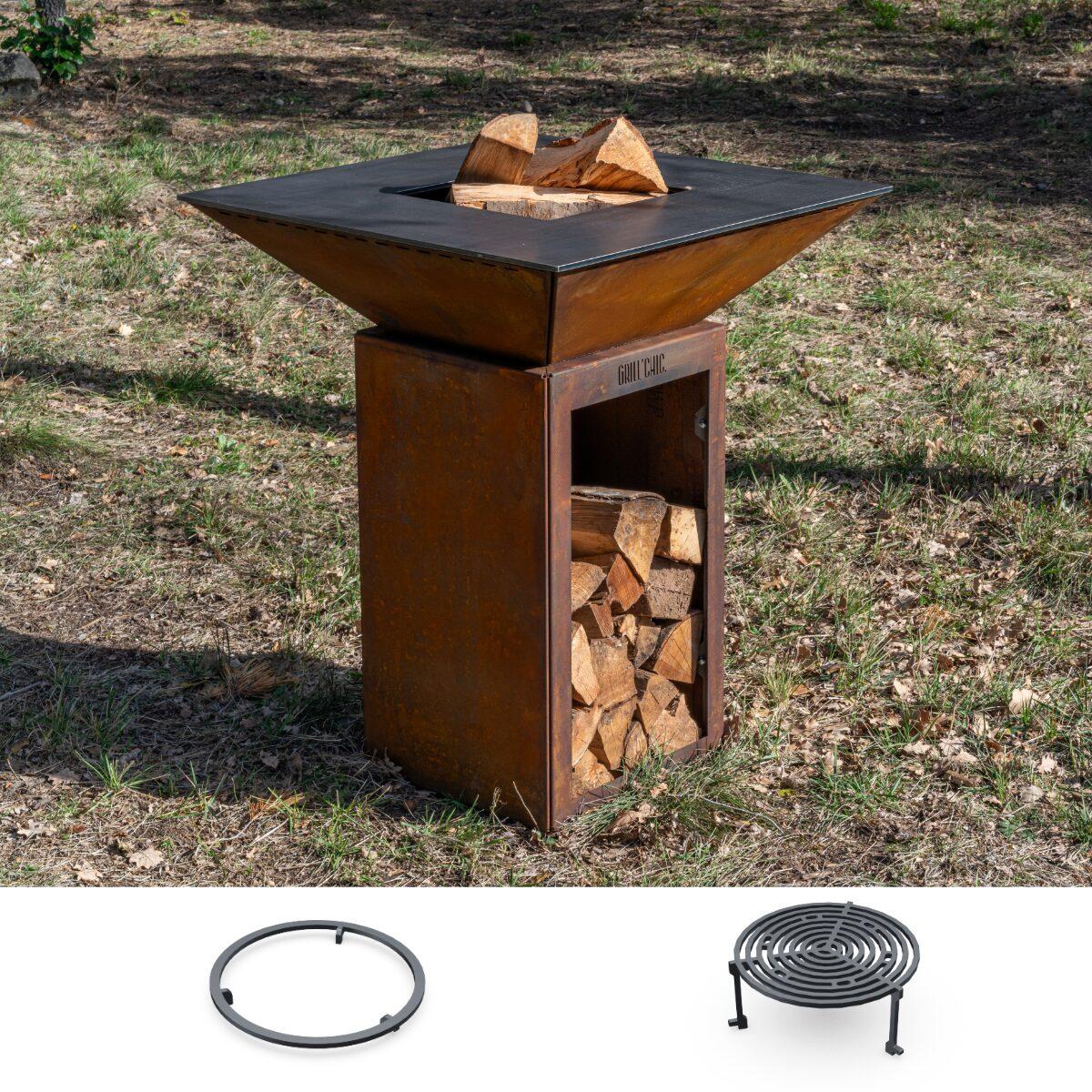 Pack Découverte Brasero CEVENOL Simple Cuve Corten Rond 74x90 cm - Avec rangement bois - Un brasero rond au style naturel pour une cuisine extérieure conviviale et