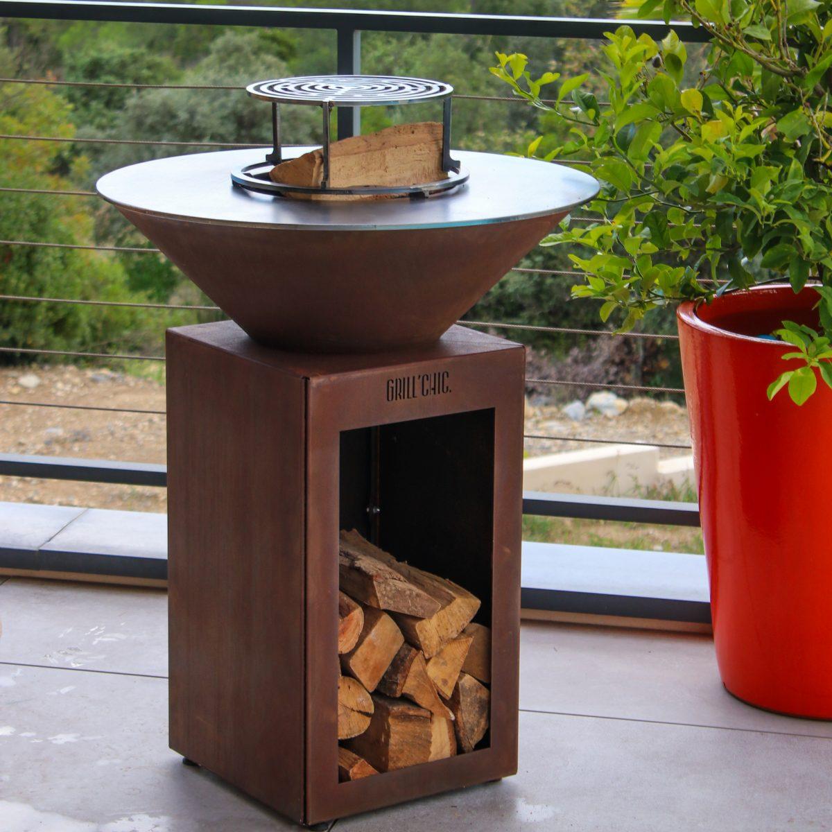 Pack Printemps Brasero Plancha Barbecue Cévenol Corten Simple Cuve Bois Rond 74x90 cm - Avec rangement bois - Un brasero rond au style authentique et chaleureux
