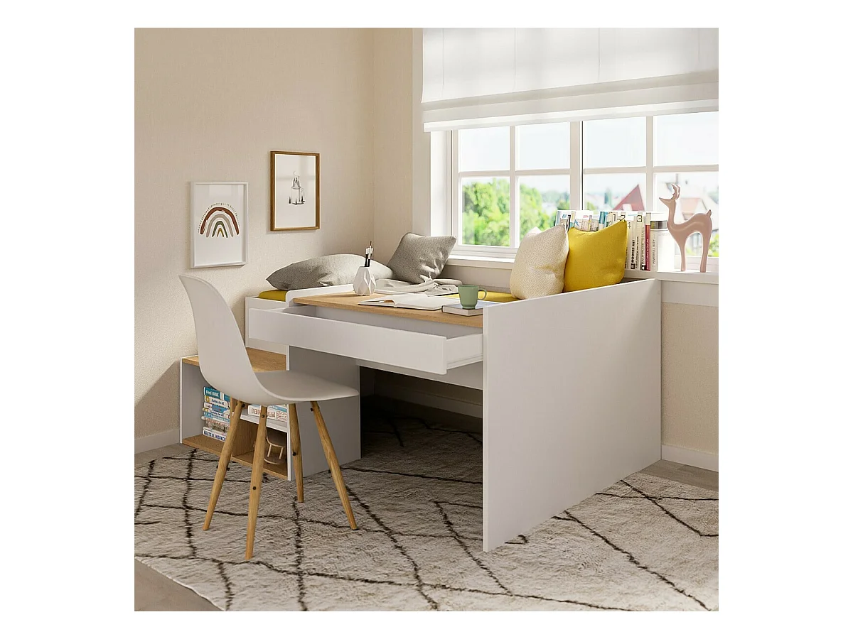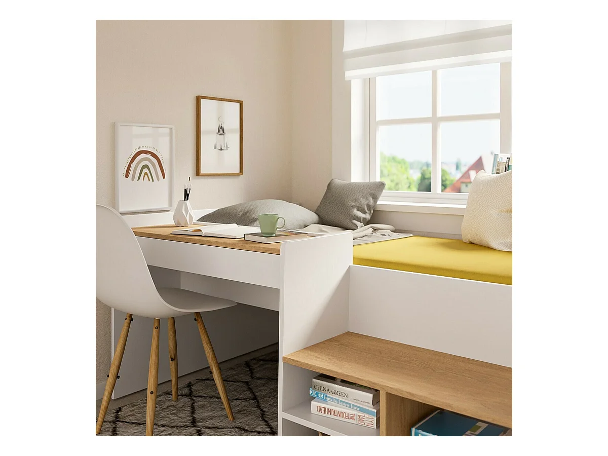 Pack Lit combiné avec bureau et matelas 90x190 cm panneaux de fibres blanc et noisette BORUTO