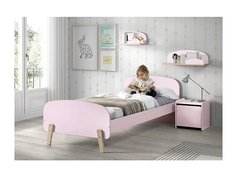 Pack - Lit Enfant, Chevet & 2 Étagères "Kiddy" 90x200cm Rose