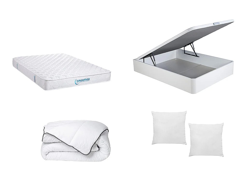 Ensemble literie 160 x 200 cm - sommier coffre blanc + matelas ressorts ensachés + couette + 2 oreillers - PRESTIGE