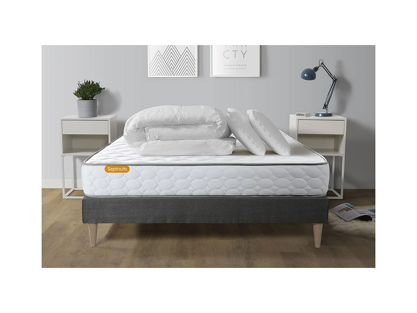 Pack matelas Memo + sommier kit gris 140x200 + 2 oreillers mémoire de forme