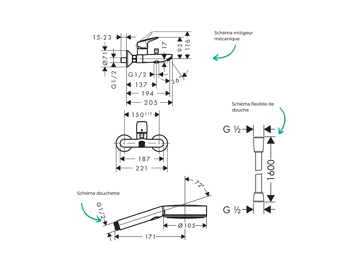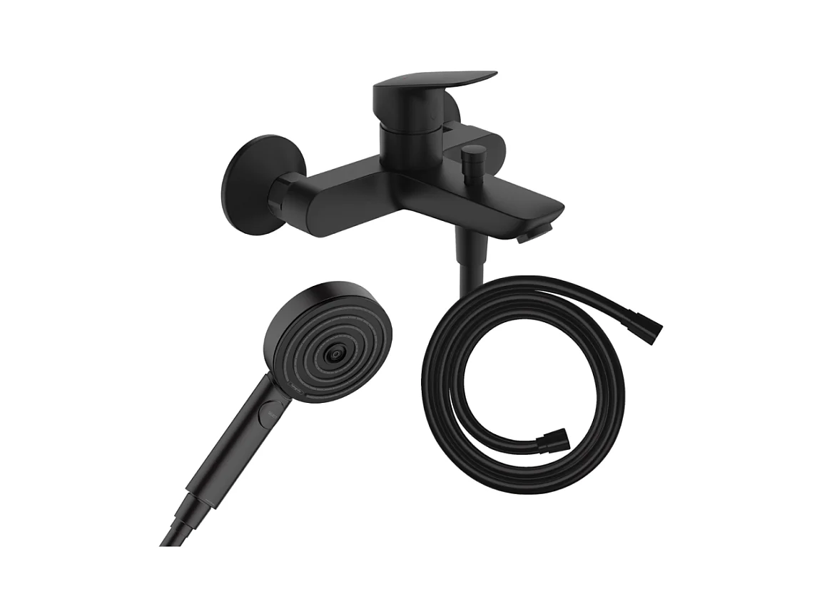 Pack mitigeur bain douche HANSGROHE Logis + Flexible Isiflex + Pommeau HANSGROHE Pulsify Select 105 3 jets noir mat