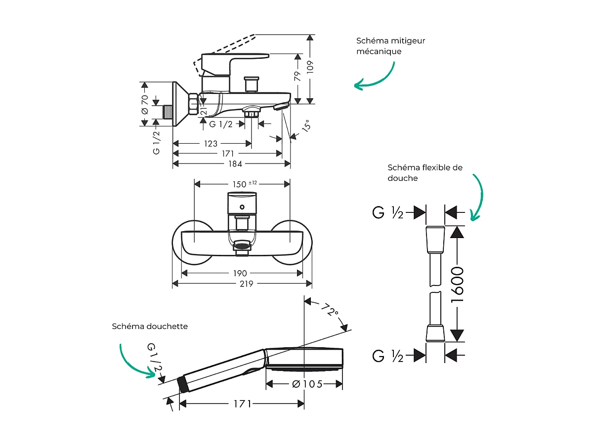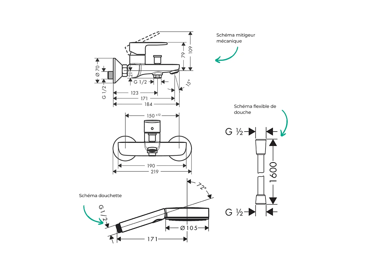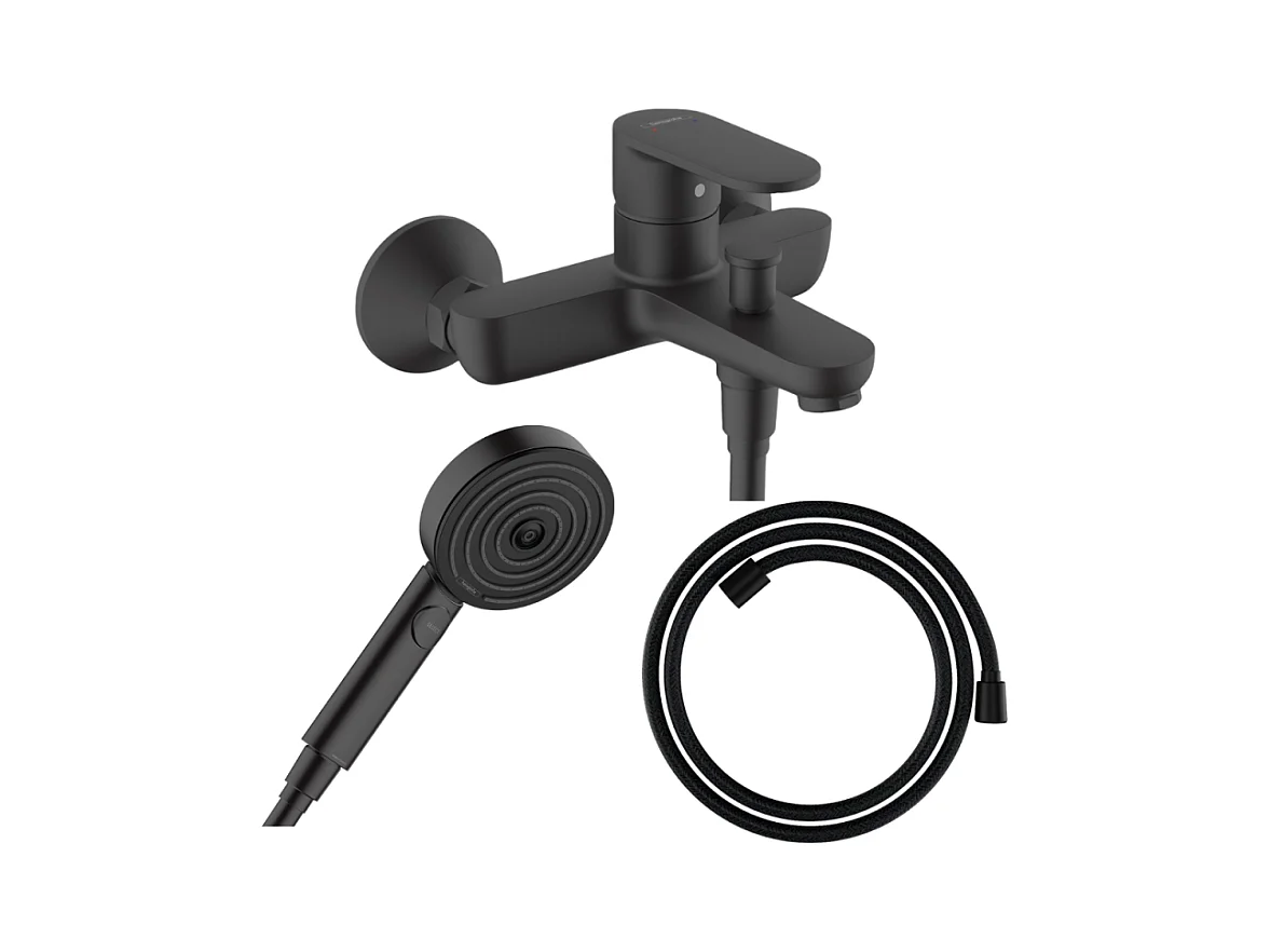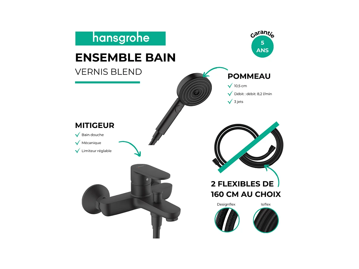 Pack mitigeur bain douche HANSGROHE Vernis Blend + Flexible Designflex + Pommeau HANSGROHE Pulsify Select 105 3 jets noir mat