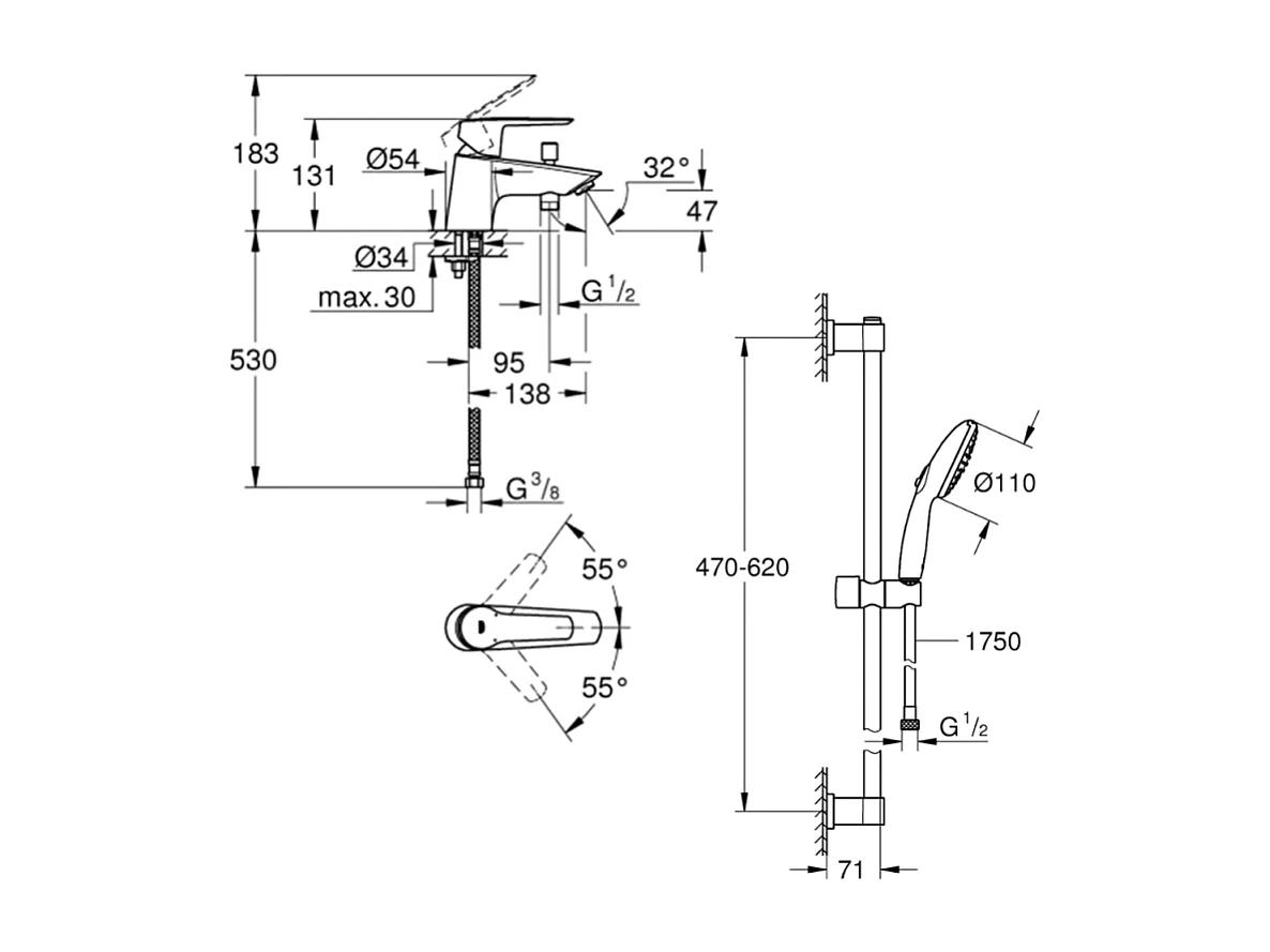 Pack mitigeur bain douche monotrou GROHE Start 2021 Quickfix + Ensemble de douche 2 jets GROHE Vitalio Start 110 chromé
