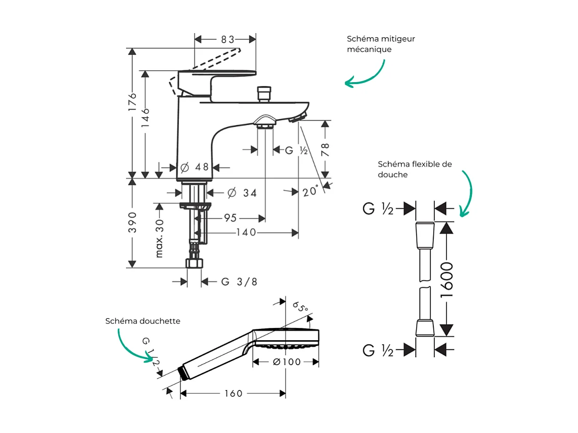 Pack mitigeur bain douche monotrou HANSGROHE Vernis Blend + Flexible Isiflex + Pommeau HANSGROHE Vernis Blend 100 Vario chromé