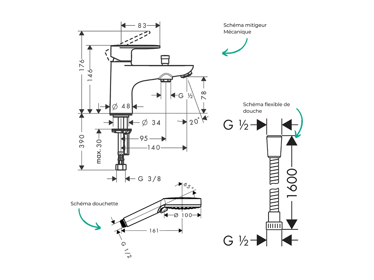 Pack mitigeur bain douche monotrou HANSGROHE Vernis Blend + Flexible Metaflex + Pommeau HANSGROHE Vernis Blend 100 Vario chromé