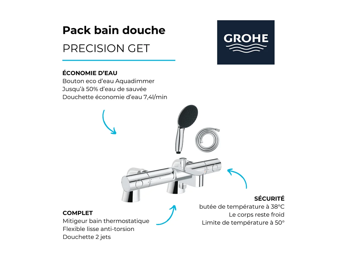 Pack mitigeur bain douche thermostatique GROHE Precision Get + douchette ronde 2 jets + flexible