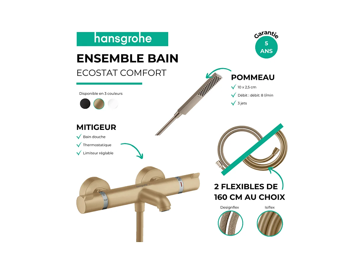 Pack mitigeur bain douche thermostatique HANSGROHE Ecostat Comfort + Flexible Designflex + Pommeau Pulsify E bronze brossé