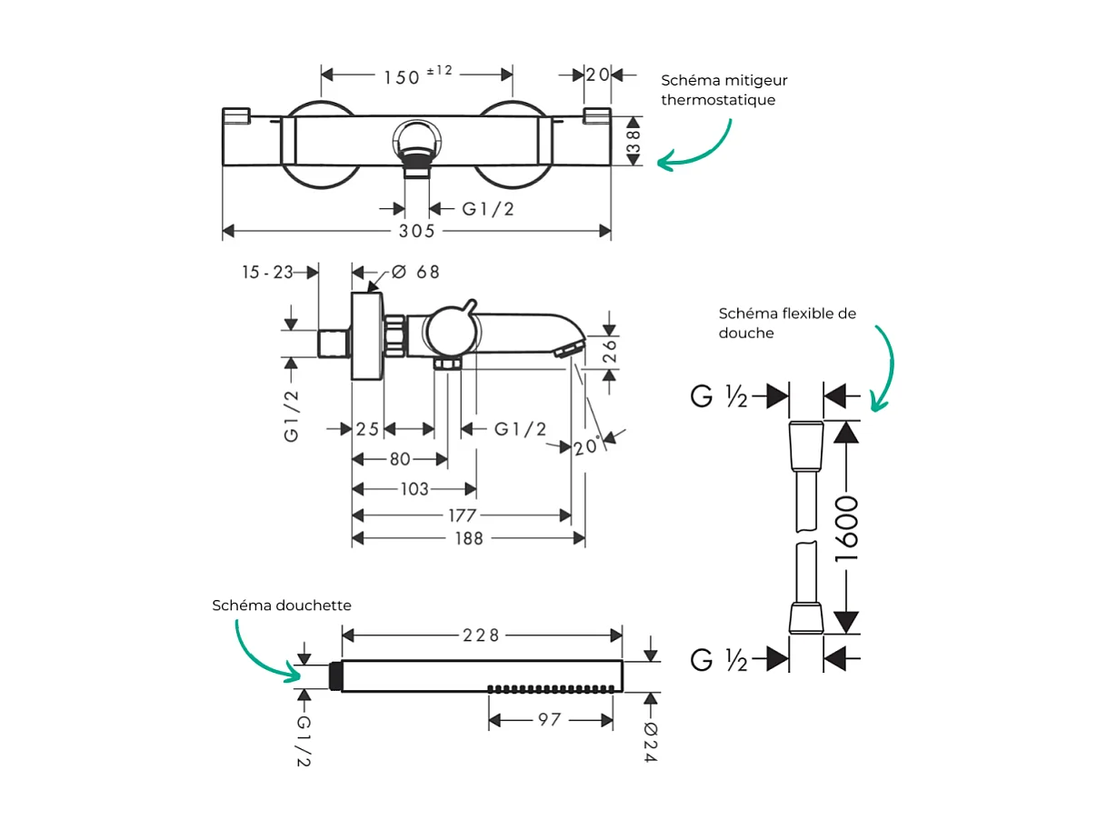 Pack mitigeur bain douche thermostatique HANSGROHE Ecostat Comfort + Flexible Designflex + Pommeau Pulsify S bronze brossé