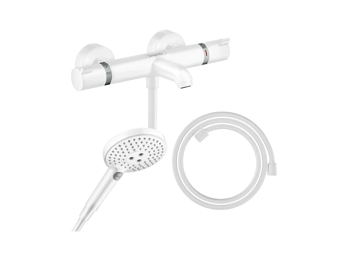 Pack mitigeur bain douche thermostatique HANSGROHE Ecostat Comfort + Flexible Designflex + Pommeau Raindance Select 3jets blanc