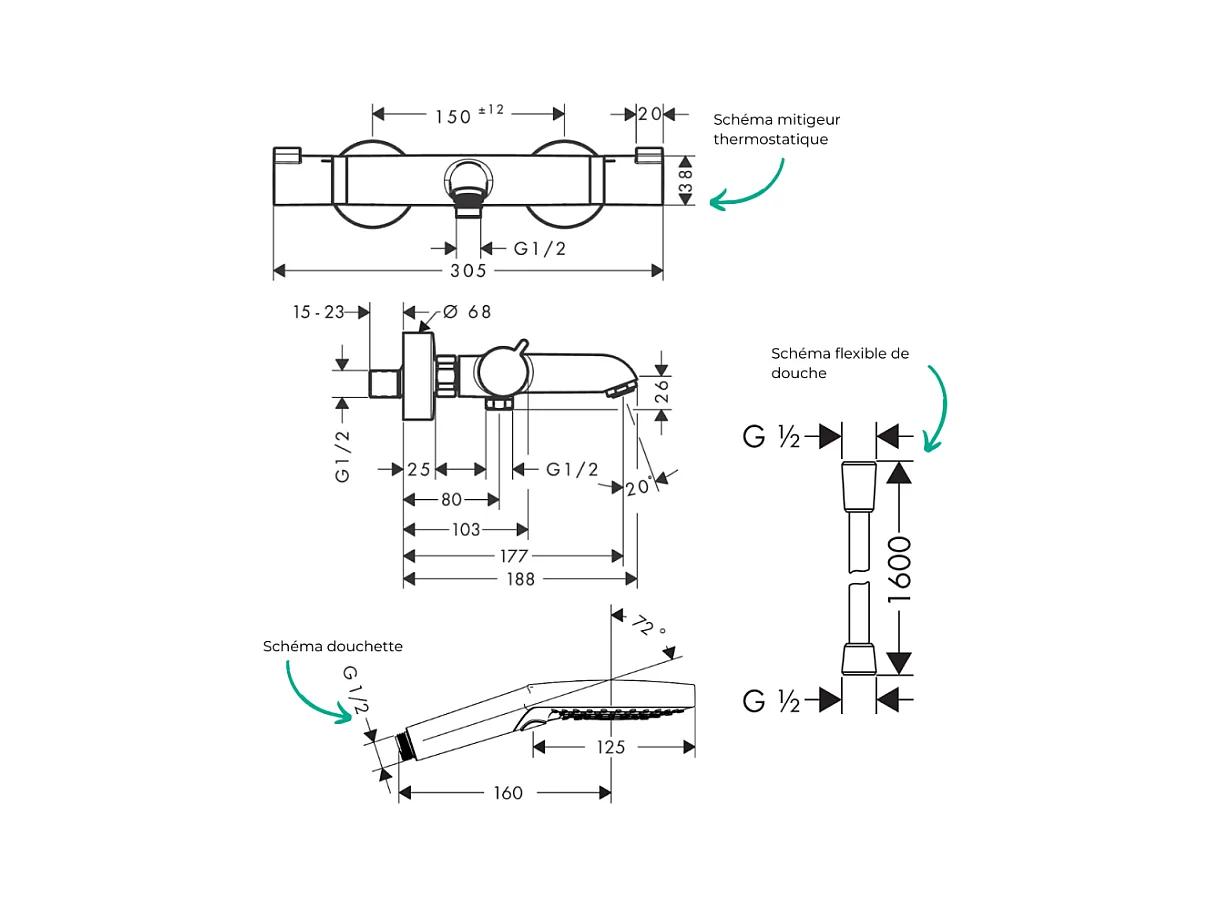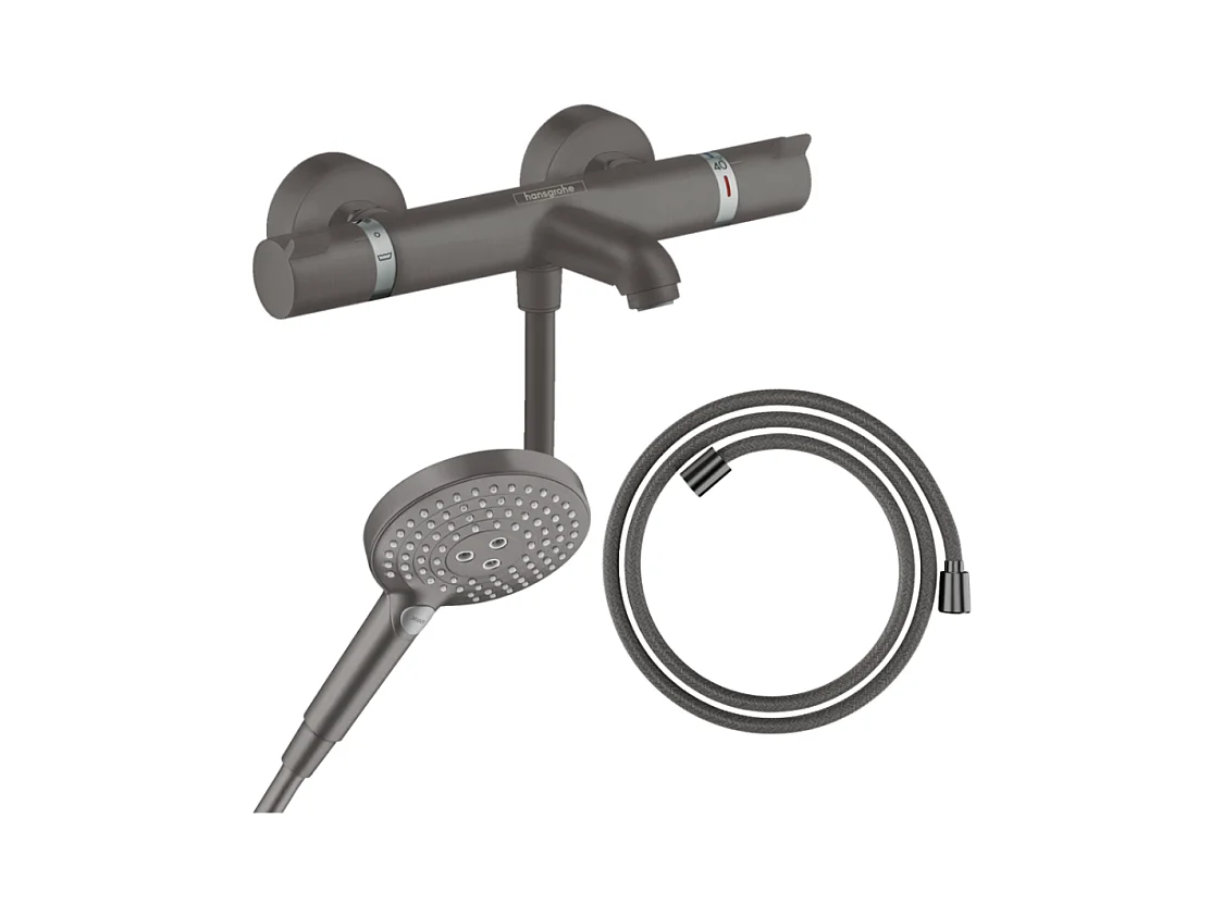 Pack mitigeur bain douche thermostatique HANSGROHE Ecostat Comfort + Flexible Designflex + Pommeau Raindance Select 3jets noir