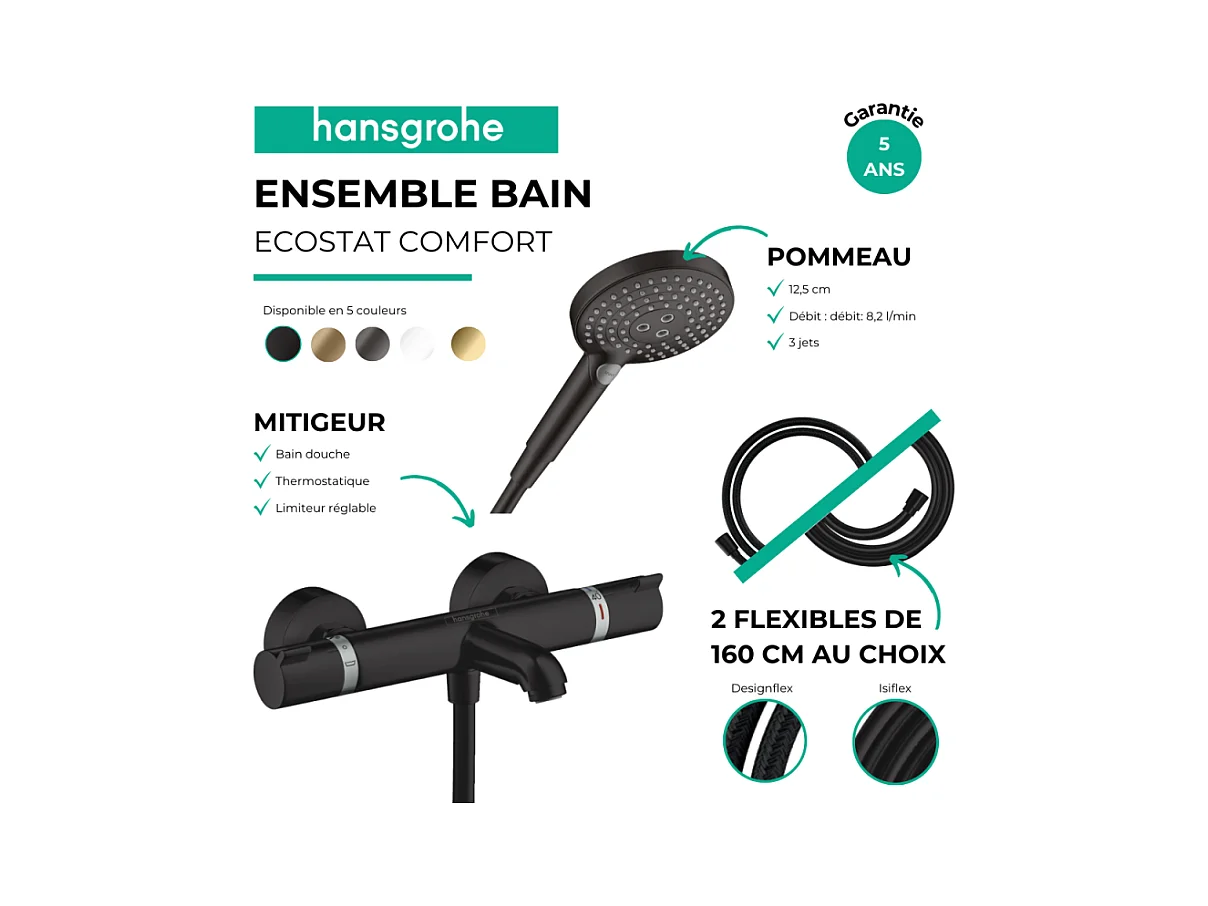 Pack mitigeur bain douche thermostatique HANSGROHE Ecostat Comfort + Flexible Designflex + Pommeau Raindance Select 3jets noir mat