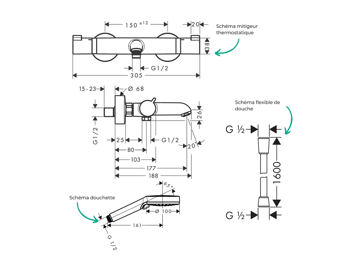 Pack mitigeur bain douche thermostatique HANSGROHE Ecostat Comfort + Flexible Designflex + Pommeau Vernis Blend Vario noir mat