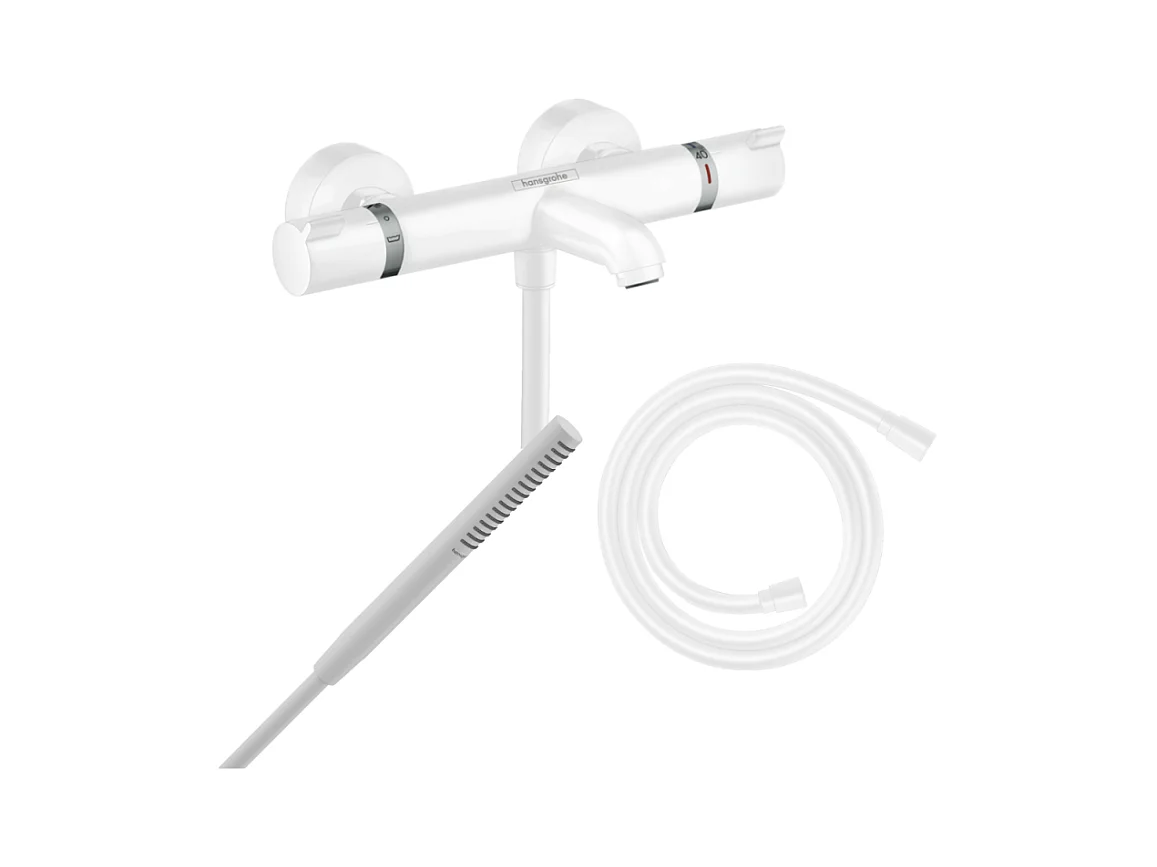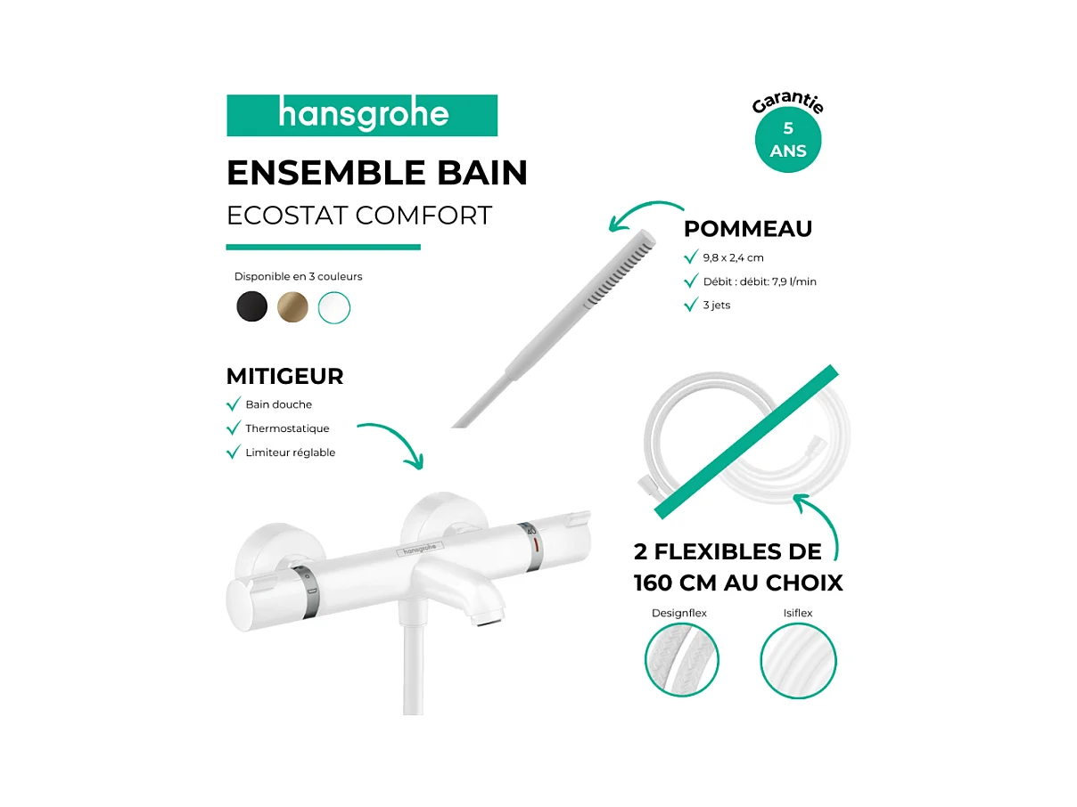 Pack mitigeur bain douche thermostatique HANSGROHE Ecostat Comfort + Flexible Isiflex + Pommeau Pulsify S blanc mat