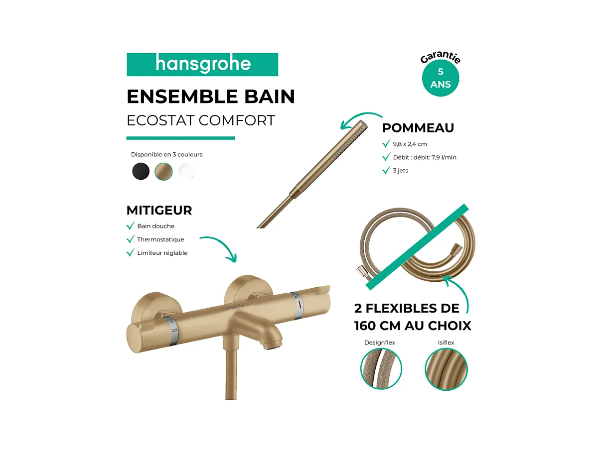 Pack mitigeur bain douche thermostatique HANSGROHE Ecostat Comfort + Flexible Isiflex + Pommeau Pulsify S bronze brossé