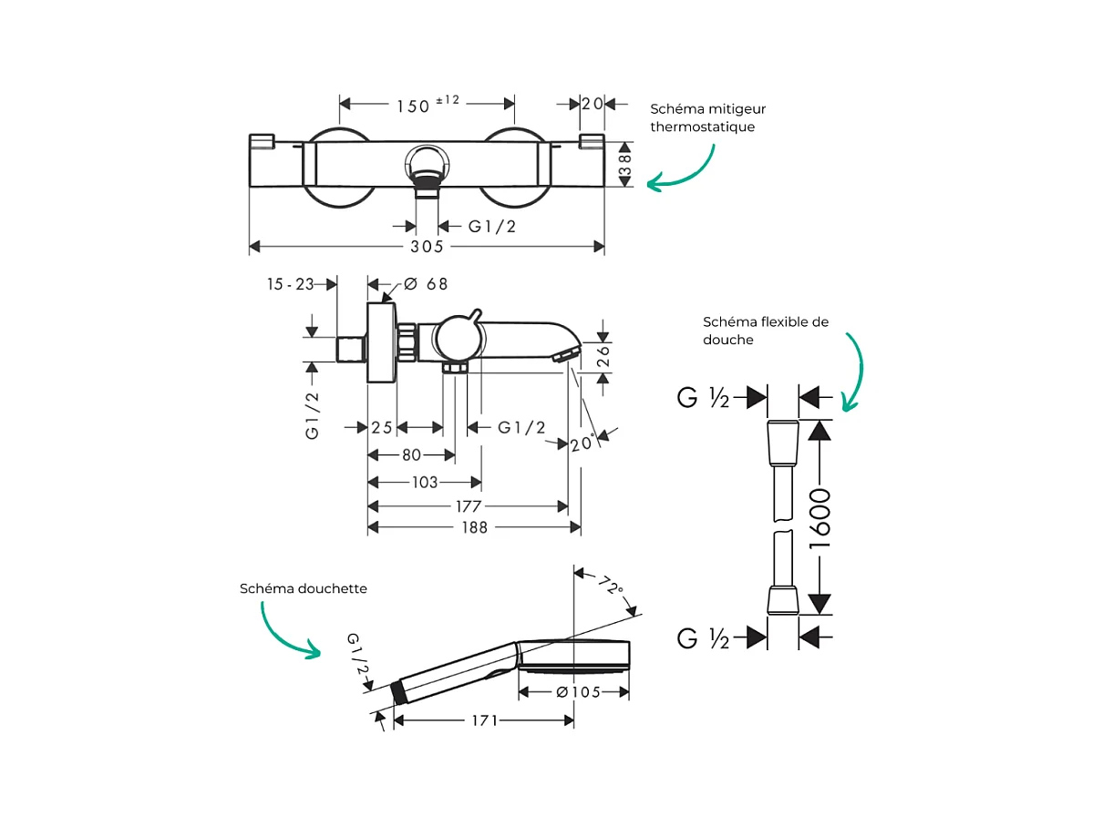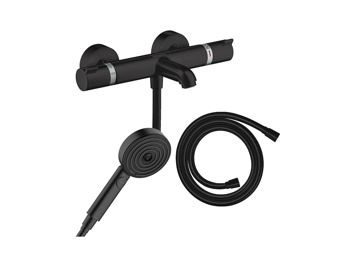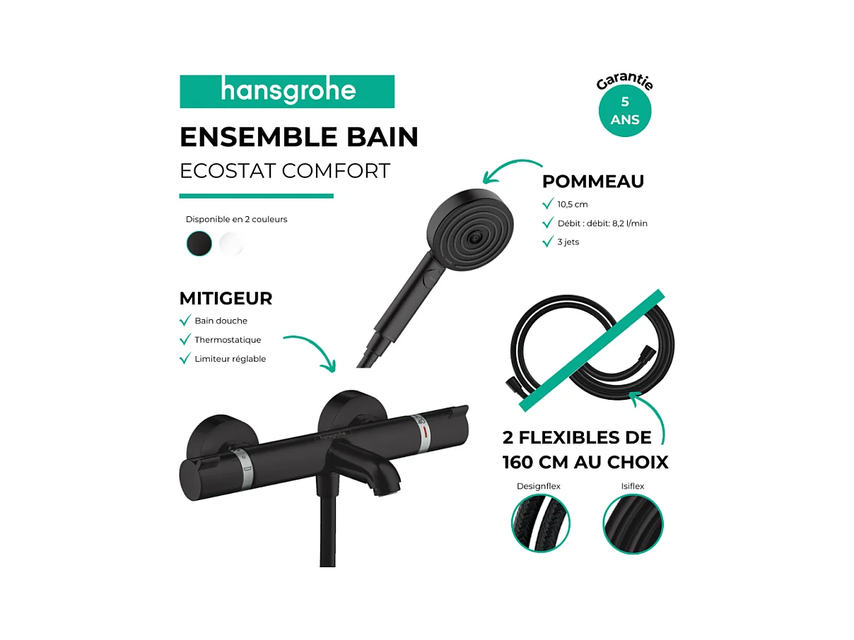 Pack mitigeur bain douche thermostatique HANSGROHE Ecostat Comfort + Flexible Isiflex + Pommeau Pulsify 3jets Relaxation noir mat