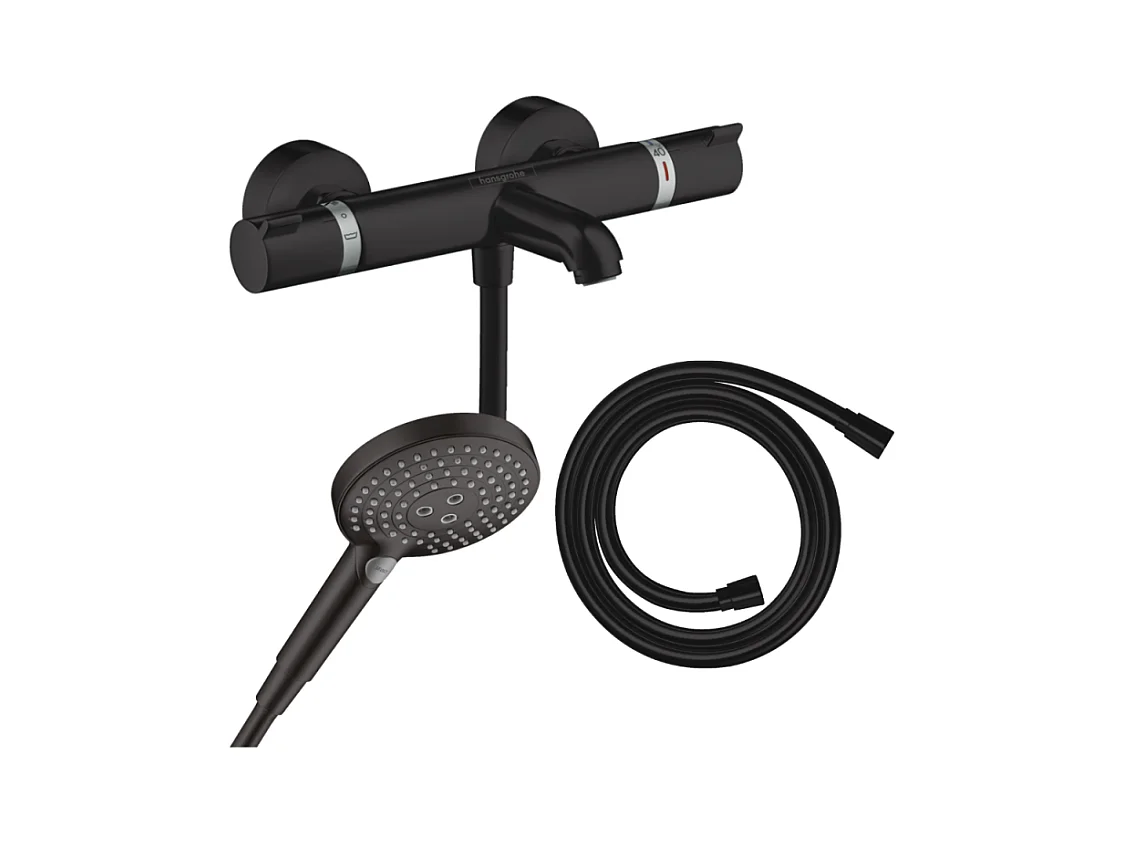Pack mitigeur bain douche thermostatique HANSGROHE Ecostat Comfort + Flexible Isiflex + Pommeau Raindance Select 3jets noir mat