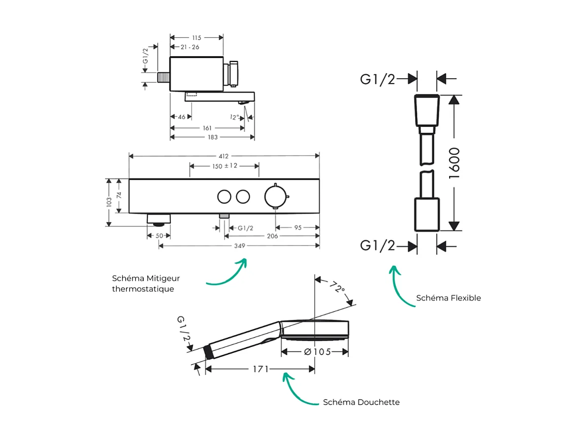 Pack mitigeur bain douche thermostatique HANSGROHE ShowerTablet Select + Flexible Designflex + Pommeau de douche Pulsify Select 3 jets Chromé