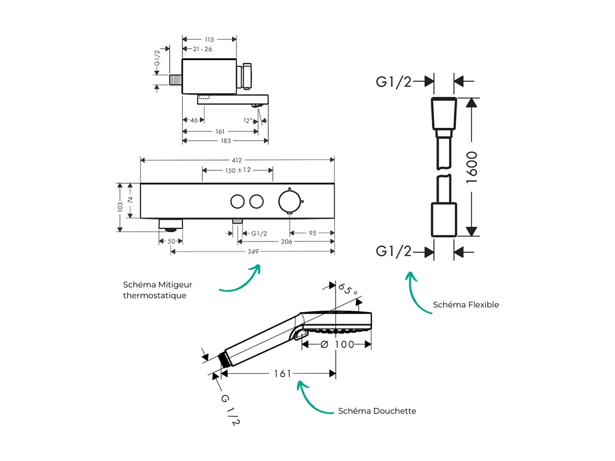 Pack mitigeur bain douche thermostatique HANSGROHE ShowerTablet Select + Flexible Designflex + Pommeau de douche Vernis Blend Chromé