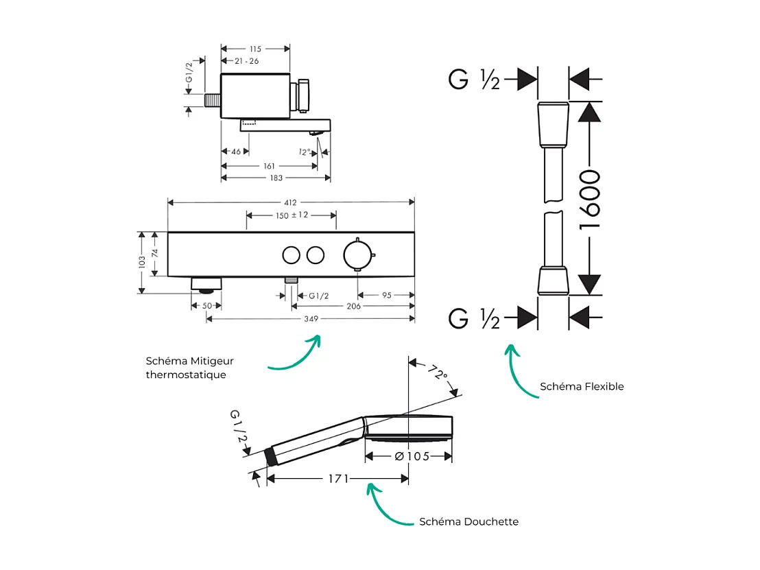 Pack mitigeur bain douche thermostatique HANSGROHE ShowerTablet Select + Flexible Isiflex + Pommeau de douche Pulsify Select 3 jets Blanc mat