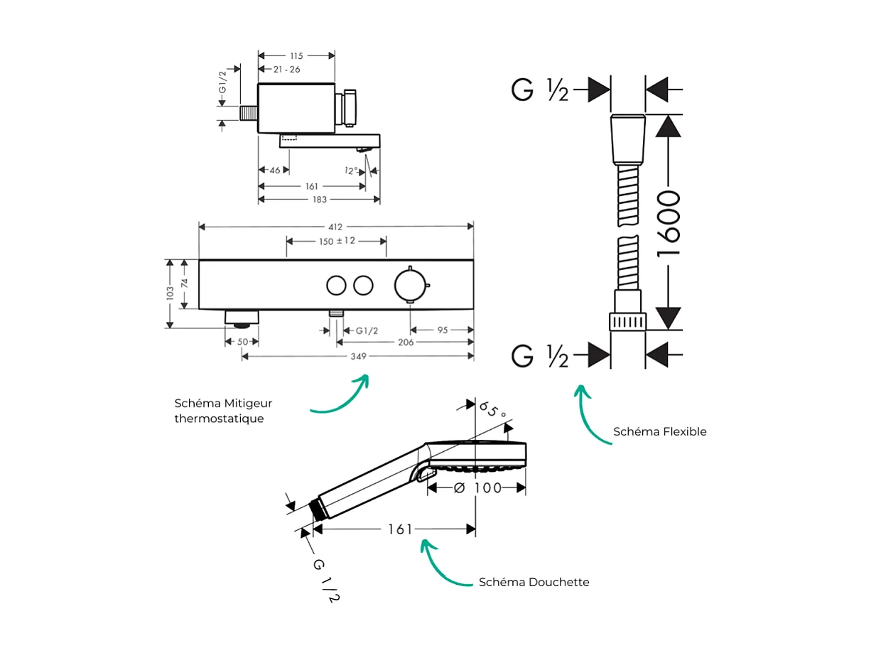 Pack mitigeur bain douche thermostatique HANSGROHE ShowerTablet Select + Flexible Metaflex + Pommeau de douche Vernis Blend Chromé