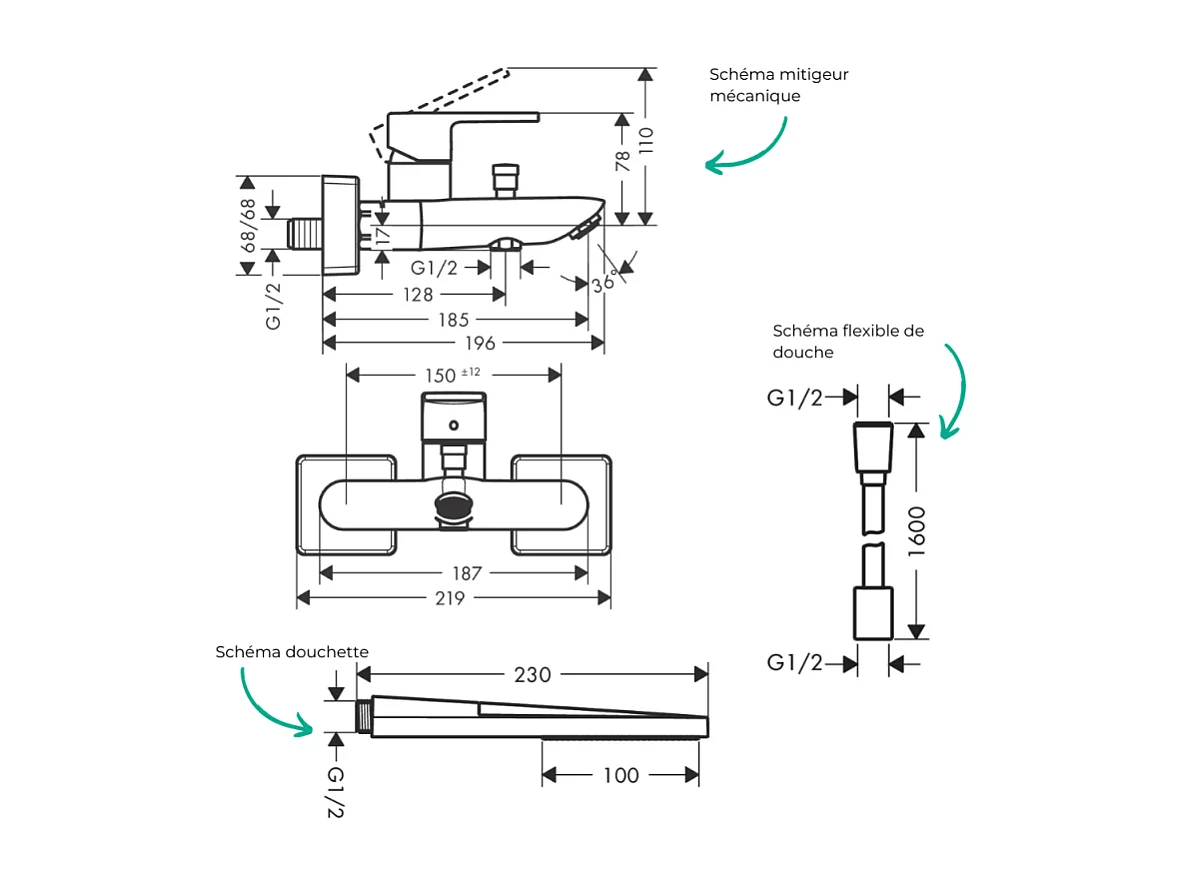 Pack mitigeur bain mécanique HANSGROHE Vernis Shape C2 + Flexible Designflex + Pommeau HANSGROHE Pulsify E 100 EcoSmart chromé
