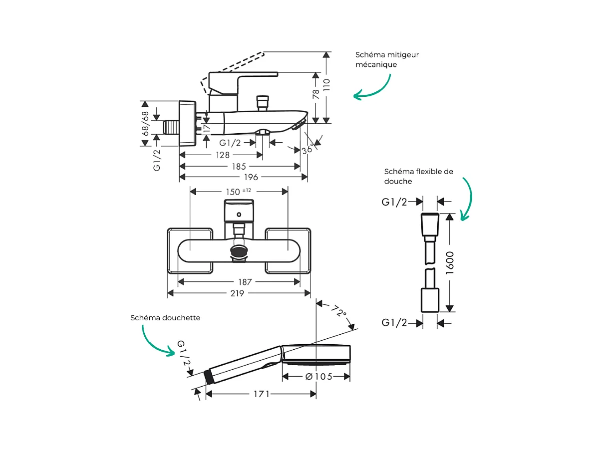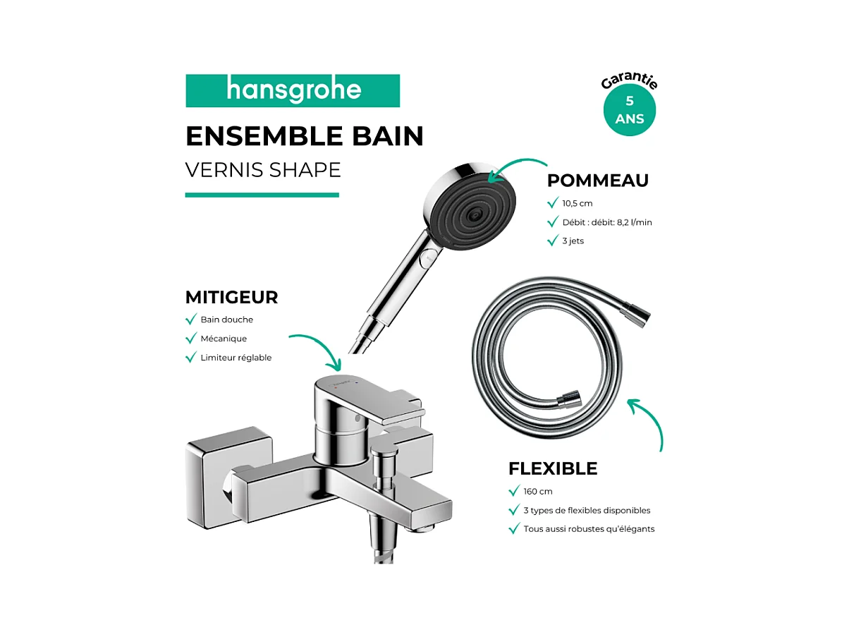 Pack mitigeur bain mécanique HANSGROHE Vernis Shape C2 + Flexible Designflex+Pommeau Pulsify Select EcoSmart 105 3jets chromé