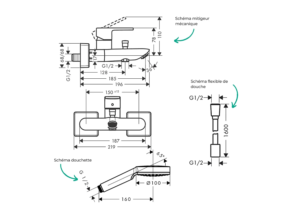 Pack mitigeur bain mécanique HANSGROHE Vernis Shape C2 + Flexible Designflex + Pommeau Vernis Blend 100 EcoSmart 1jet chromé