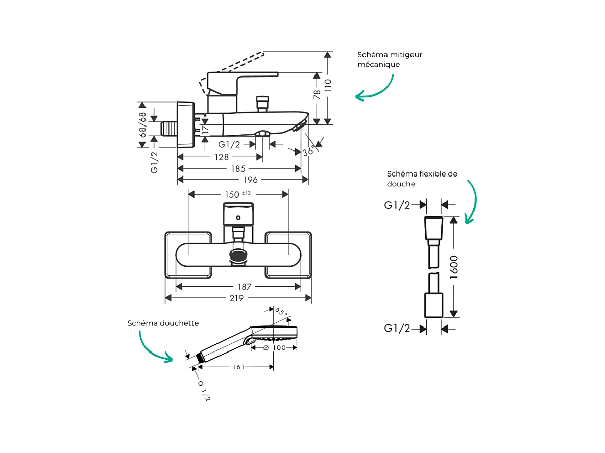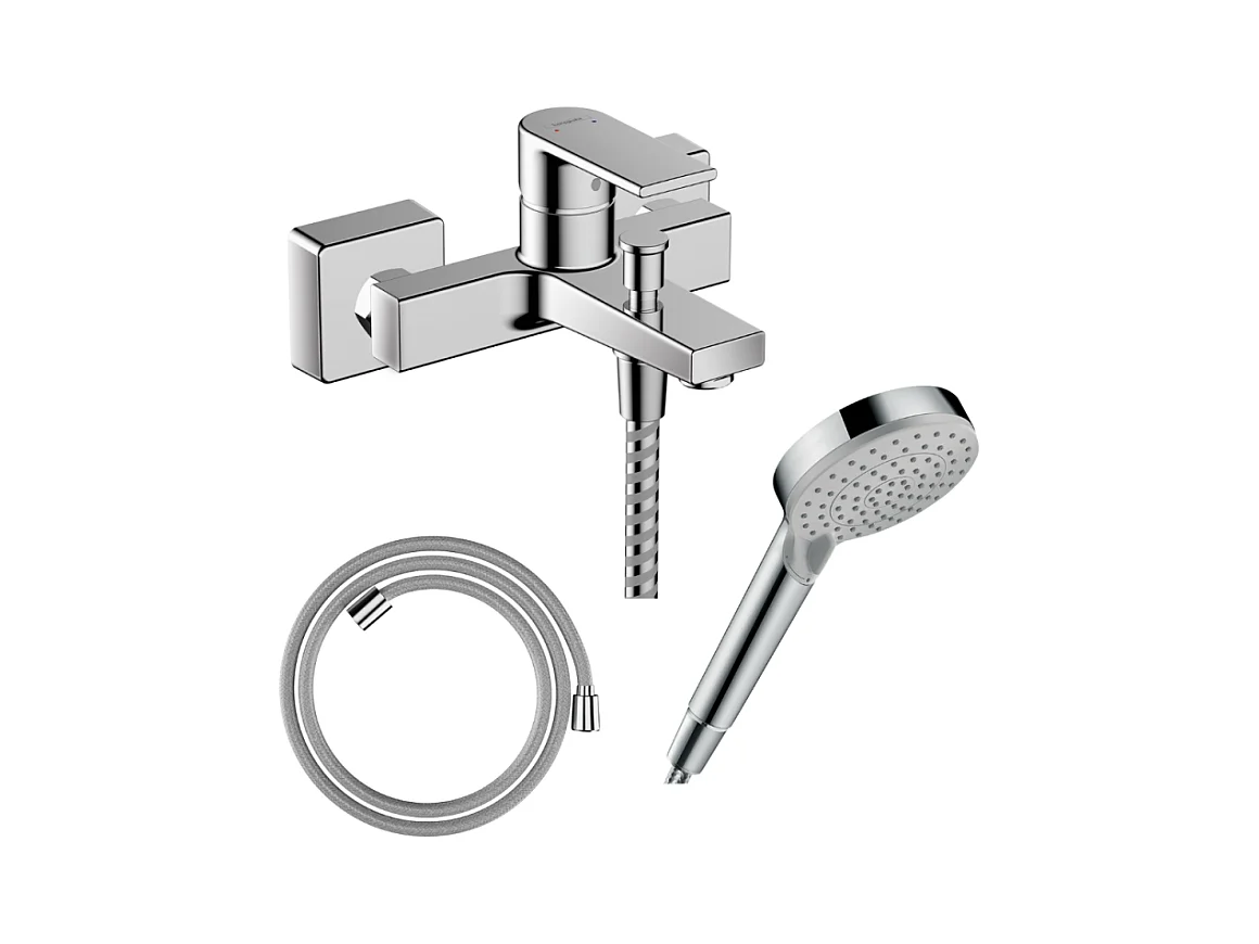Pack mitigeur bain mécanique HANSGROHE Vernis Shape C2 + Flexible Designflex + Pommeau Vernis Blend 100 EcoSmart 2jets chromé