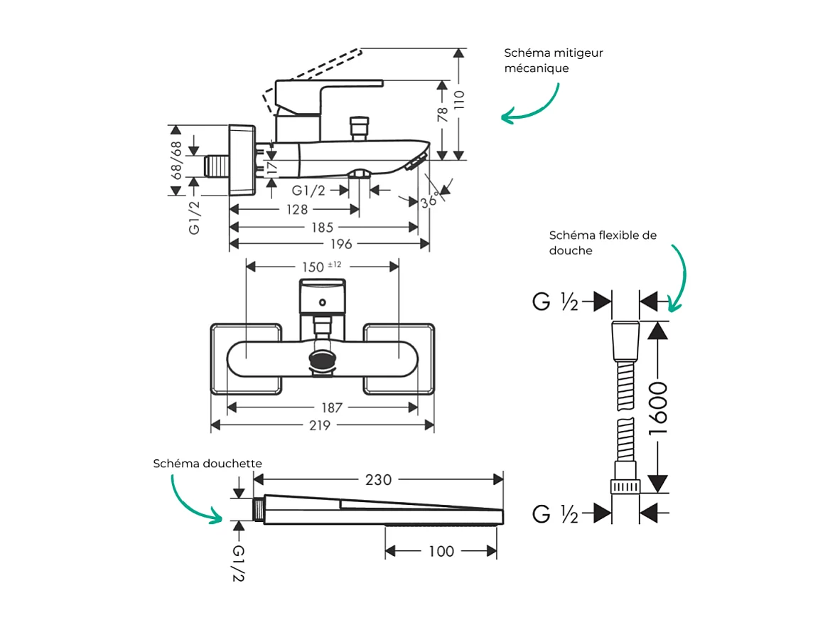 Pack mitigeur bain mécanique HANSGROHE Vernis Shape C2 + Flexible Metaflex + Pommeau HANSGROHE Pulsify E 100 EcoSmart chromé