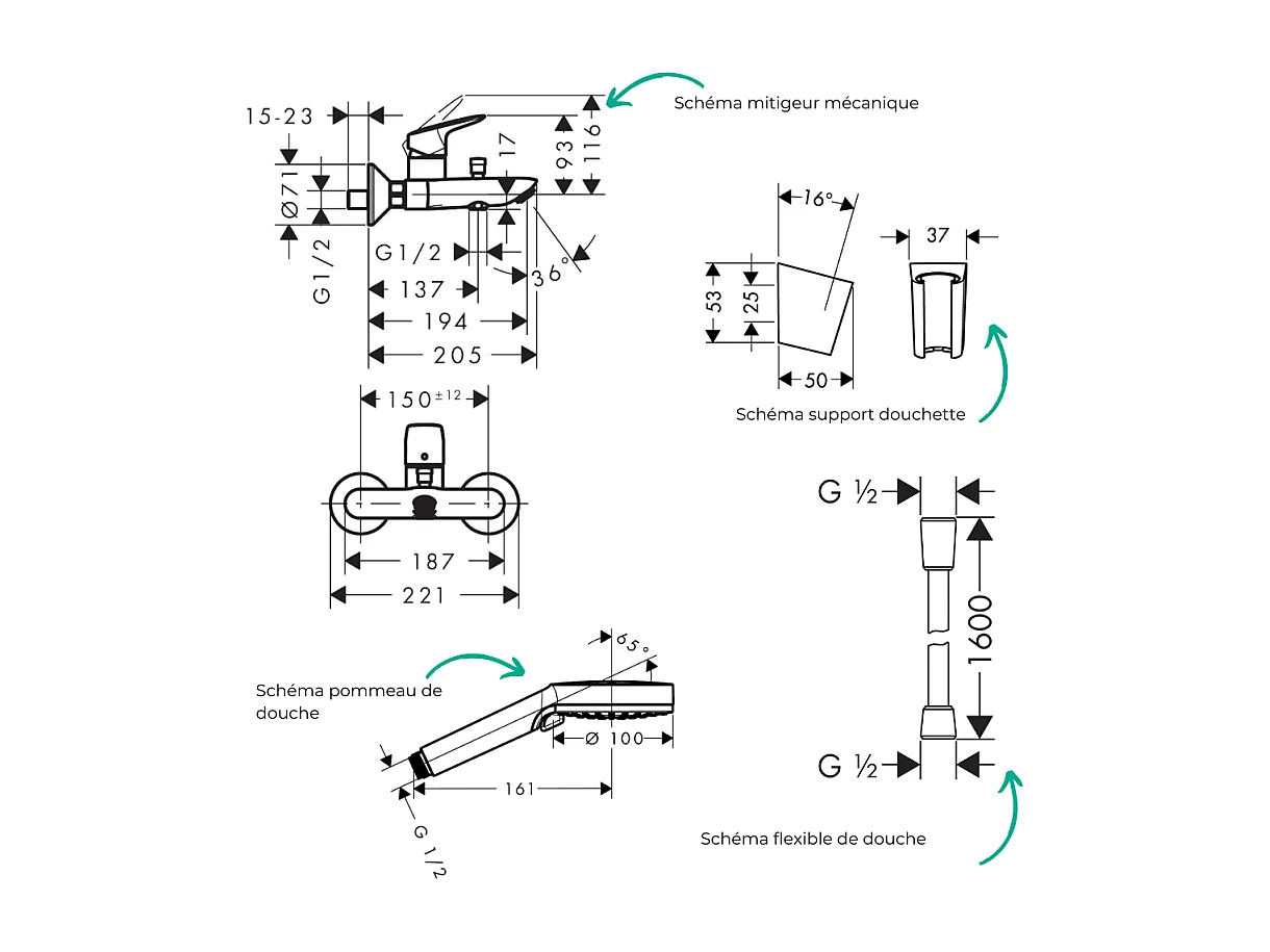 Pack mitigeur bain mécanique mural HANSGROHE Logis + Pommeau Crometta EcoSmart + Flexible Isiflex + Support Chromé