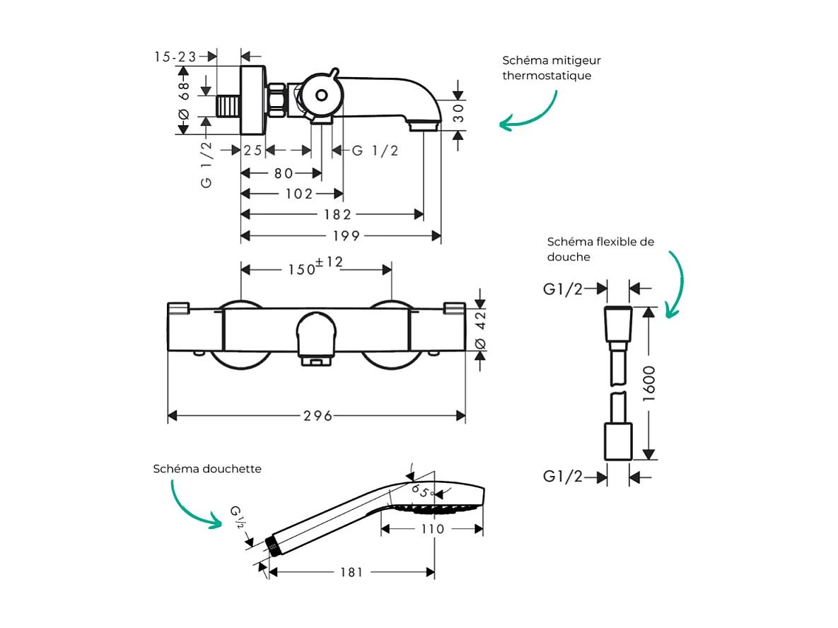Pack mitigeur bain thermostatique HANSGROHE Ecostat 1001CL + Flexible Designflex + Pommeau Croma Select E EcoSmart blanc/chromé