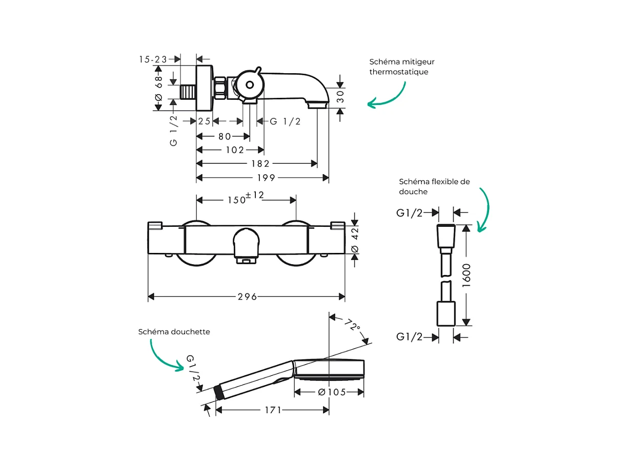 Pack mitigeur bain thermostatique HANSGROHE Ecostat 1001CL + Flexible Designflex+Pommeau Pulsify Select EcoSmart 105 3jets chromé