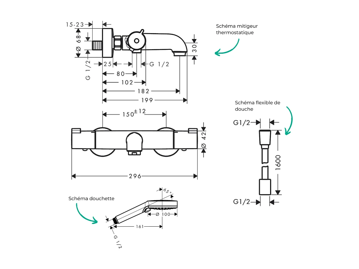 Pack mitigeur bain thermostatique HANSGROHE Ecostat 1001CL + Flexible Designflex + Pommeau Vernis Blend 100 EcoSmart 2jets chromé