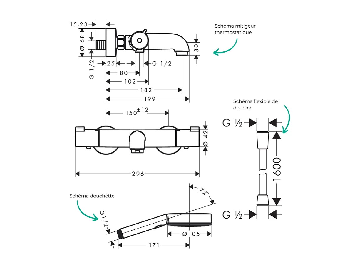Pack mitigeur bain thermostatique HANSGROHE Ecostat 1001CL + Flexible Isiflex + Pommeau Pulsify Select EcoSmart 105 3jets chromé