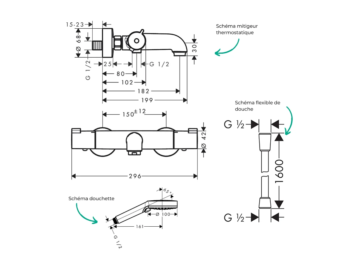 Pack mitigeur bain thermostatique HANSGROHE Ecostat 1001CL + Flexible Isiflex + Pommeau Vernis Blend 100 EcoSmart 2jets chromé