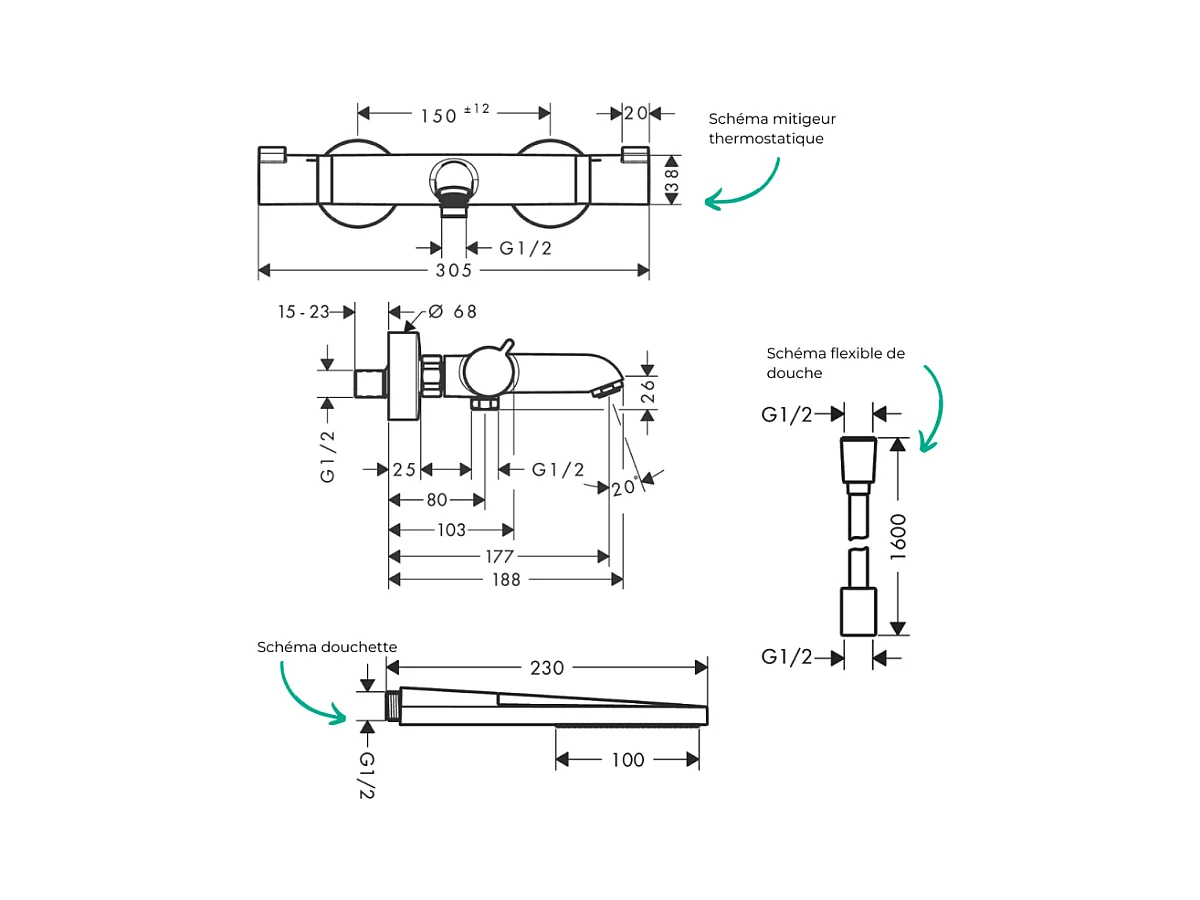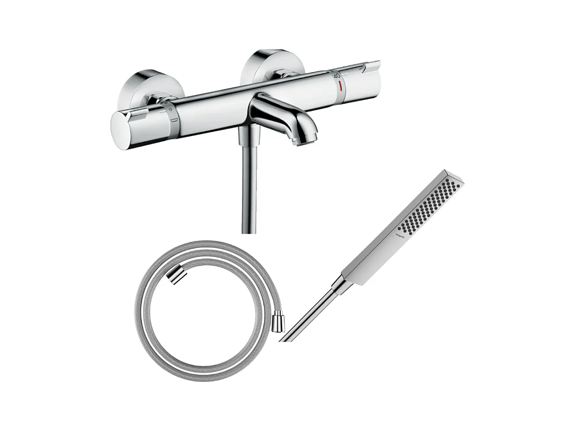 Pack mitigeur bain thermostatique HANSGROHE Ecostat Comfort + Flexible Designflex 1,6m + Pommeau Pulsify E 100 EcoSmart chromé