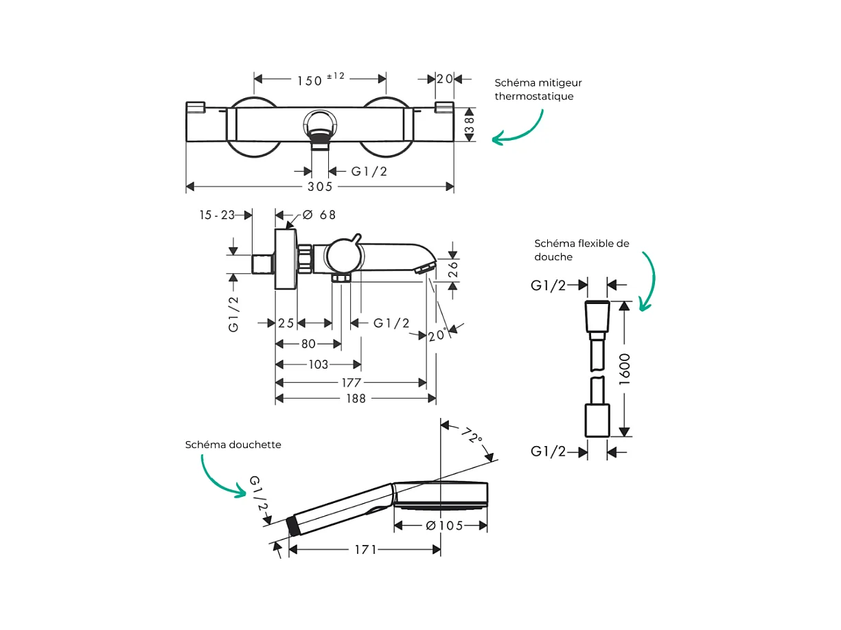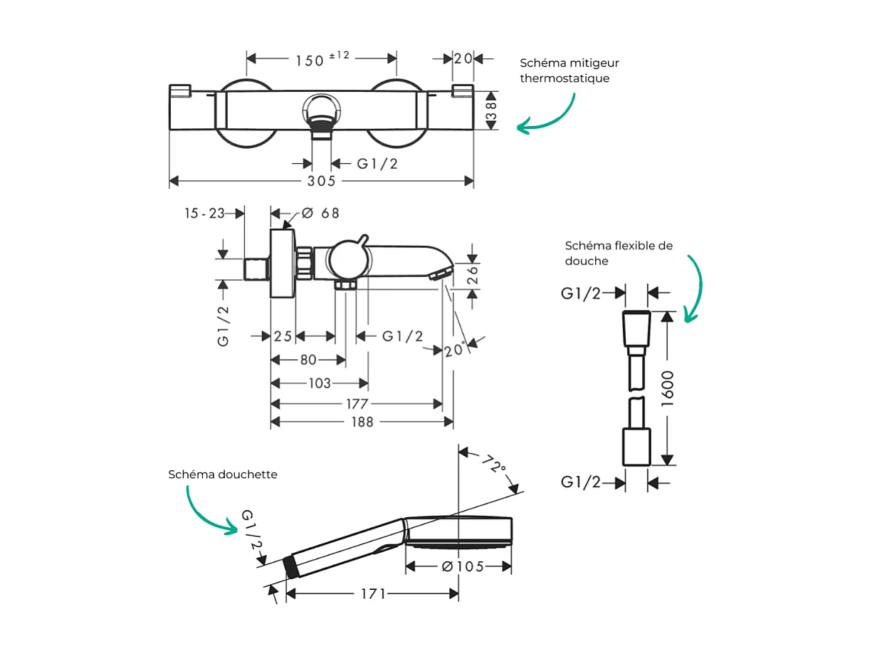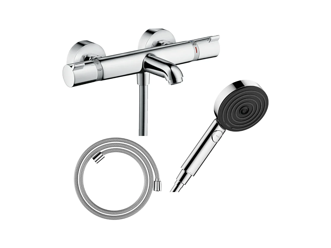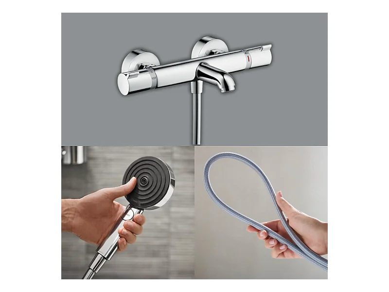 Pack mitigeur bain thermostatique HANSGROHE Ecostat Comfort + Flexible Designflex 1,6m + Pommeau Pulsify EcoSmart 3 jets chromé