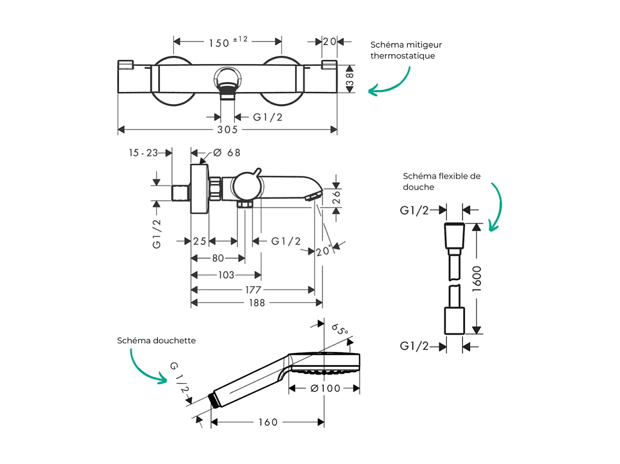 Pack mitigeur bain thermostatique HANSGROHE Ecostat Comfort + Flexible Designflex 1,6m + Pommeau Vernis Blend EcoSmart chromé