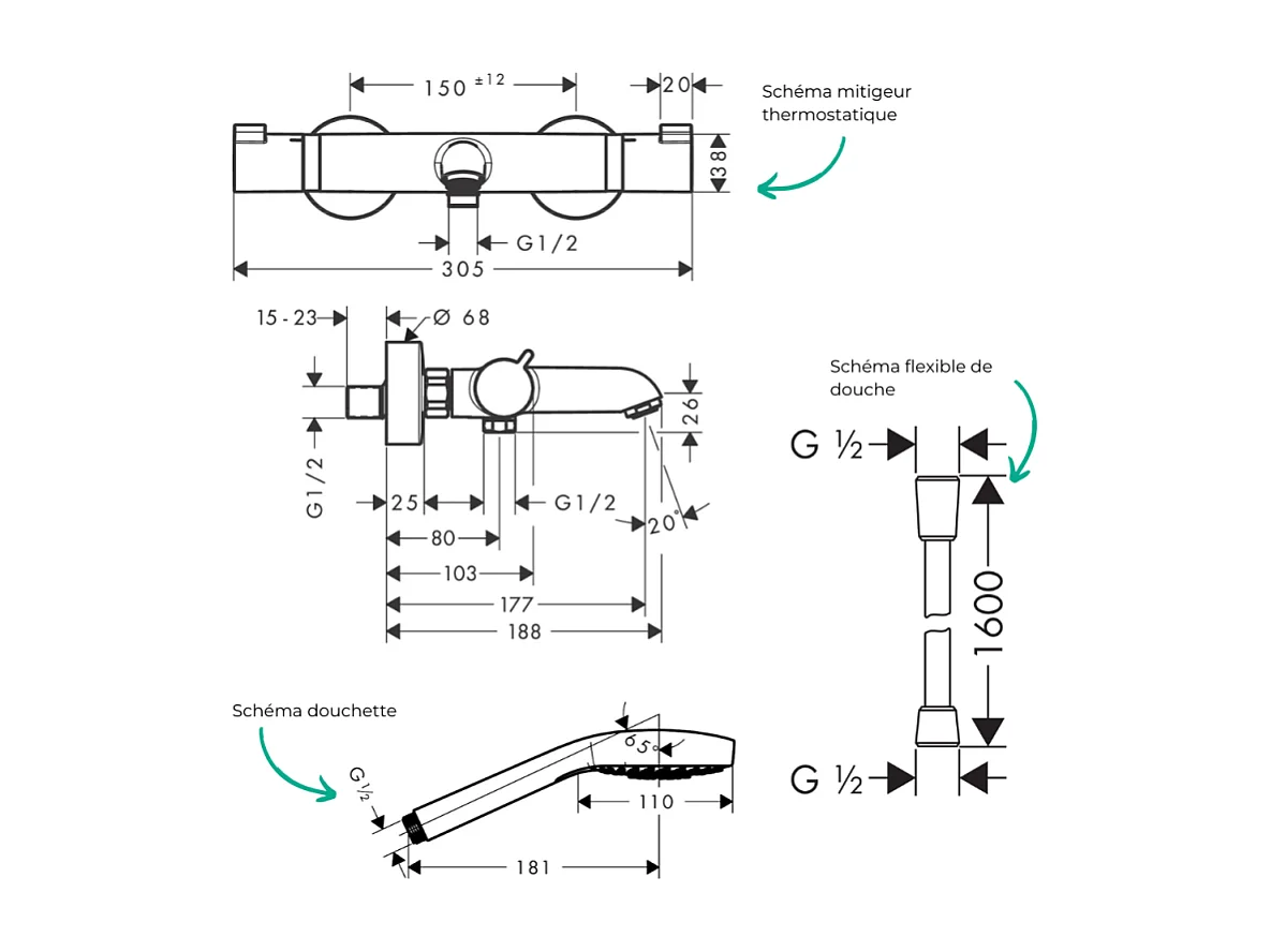 Pack mitigeur bain thermostatique HANSGROHE Ecostat Comfort + Flexible Isiflex 1,6m + Pommeau Croma Select E EcoSmart chromé