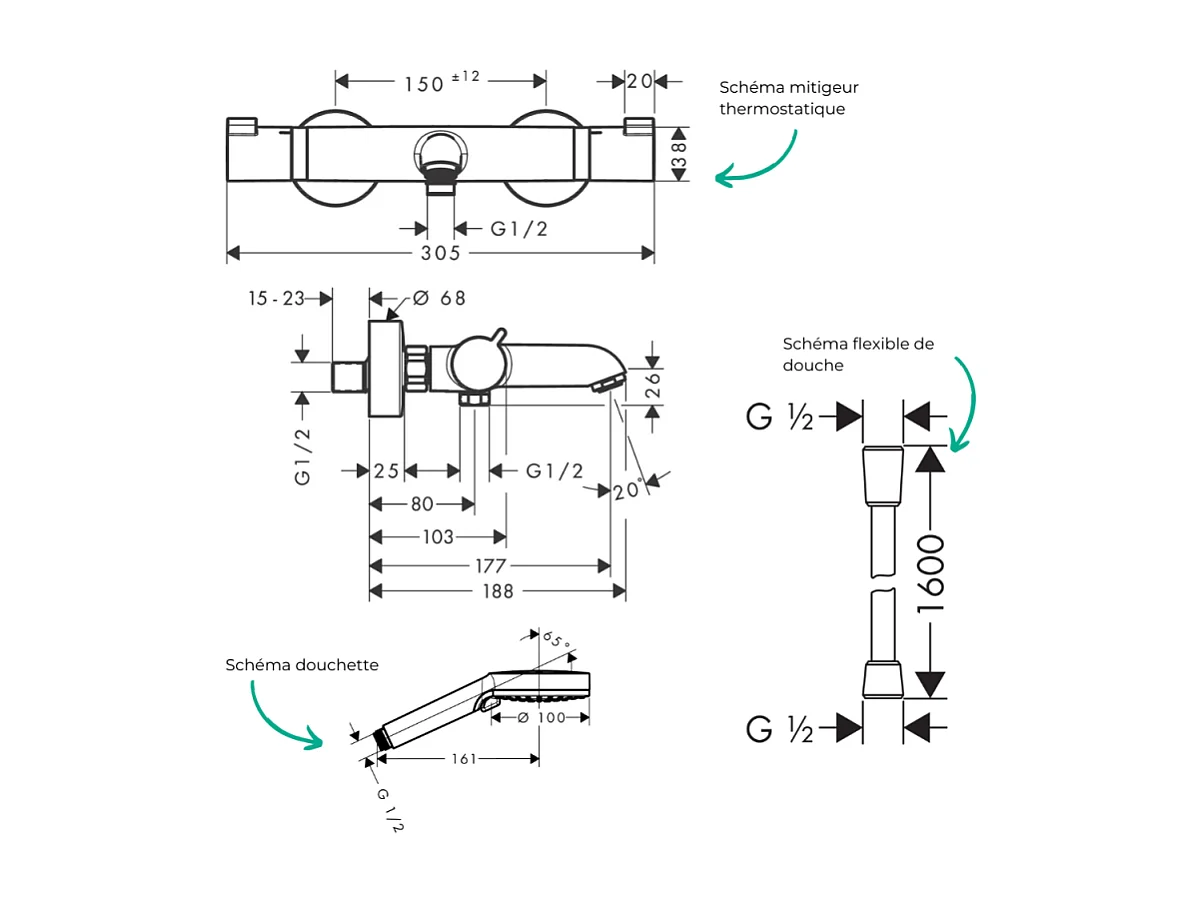 Pack mitigeur bain thermostatique HANSGROHE Ecostat Comfort + Flexible Isiflex 1,6m + Pommeau Vernis Blend EcoSmart 2 jets chromé