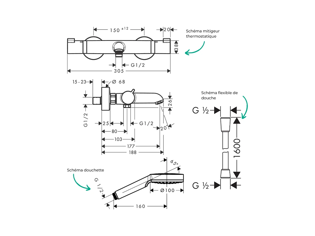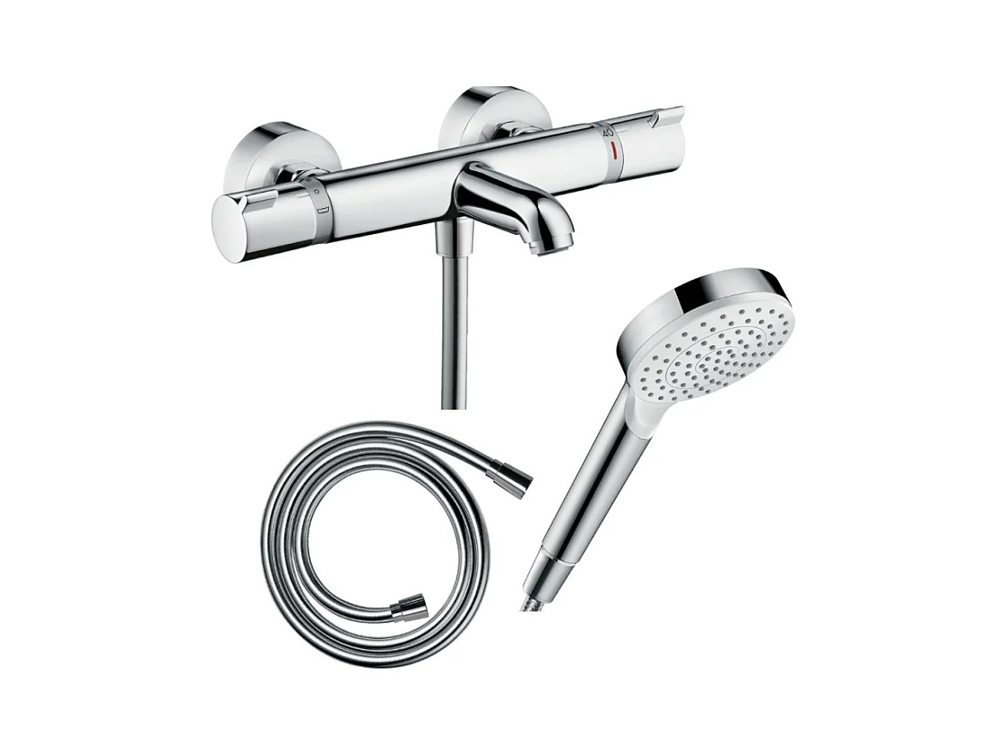 Pack mitigeur bain thermostatique HANSGROHE Ecostat Comfort + Flexible Isiflex 1,6m + Pommeau Vernis Blend EcoSmart chromé
