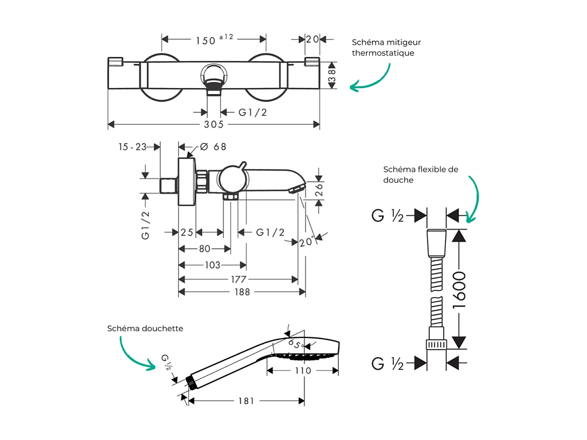 Pack mitigeur bain thermostatique HANSGROHE Ecostat Comfort + Flexible Metaflex 1,6m + Pommeau Croma Select E EcoSmart chromé
