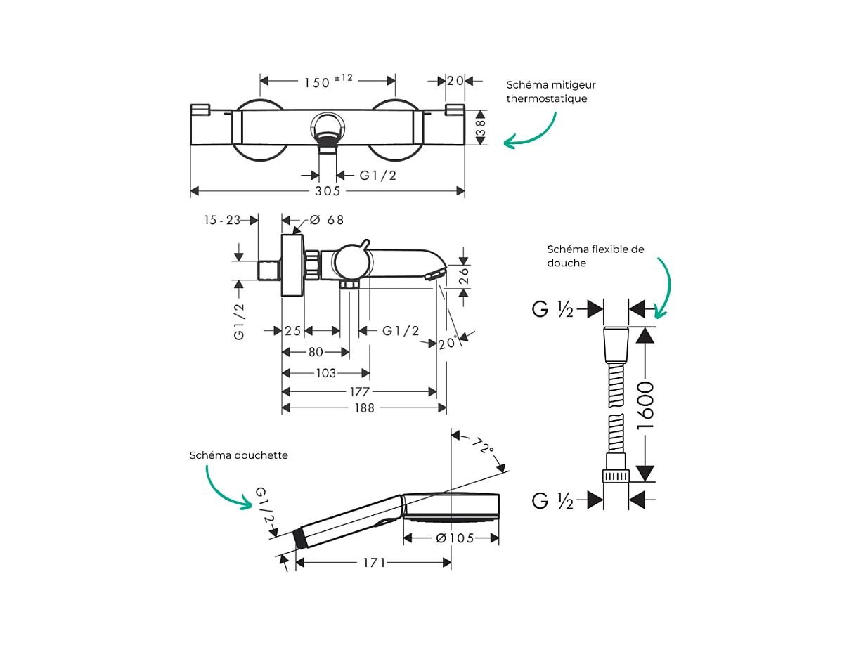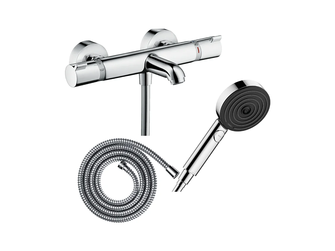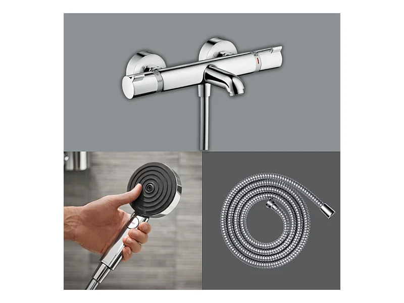 Pack mitigeur bain thermostatique HANSGROHE Ecostat Comfort + Flexible Metaflex 1,6m + Pommeau Pulsify EcoSmart 3 jets chromé